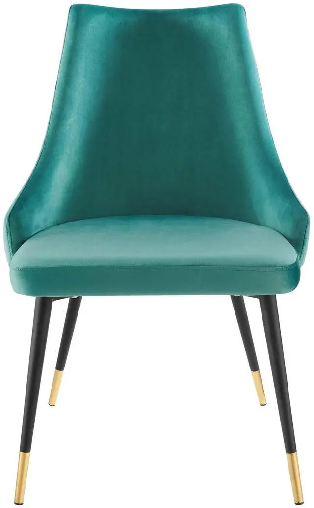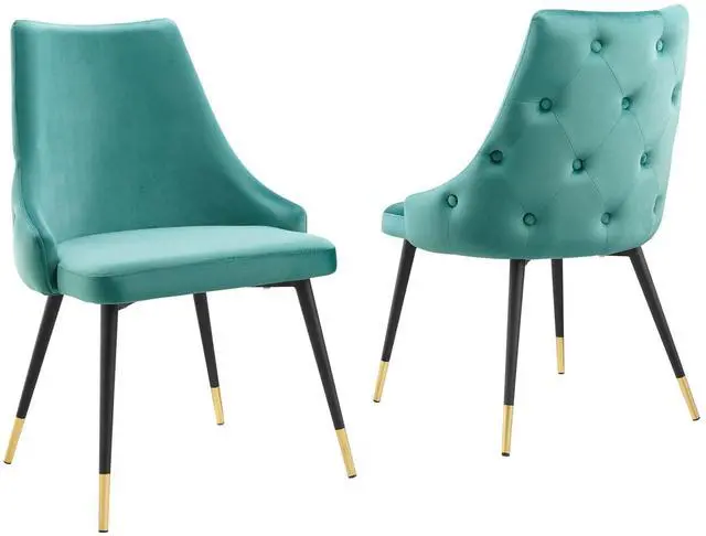 Revitalize dining decor or your living space with the Adorn Tufted Performance Velvet Dining Side Chair. Classic button tufting along the chair's exterior and graceful sweeping lines blend seamlessly into the lush comfort of this dining chair. With soft stain-resistant performance velvet upholstery, this accent chair offers a comfortable place to rest with dense foam padding. Sitting on four black tapered legs with gold foot sleeves, Adorn's versatile vintage modern style and glam deco charm makes this side chair ideally suited for a variety of rooms. Place this velvet chair around the dining table, or use it as an accent chair in the living room, bedroom or entryway, or update your home office seating with use as a cute desk chair.