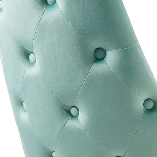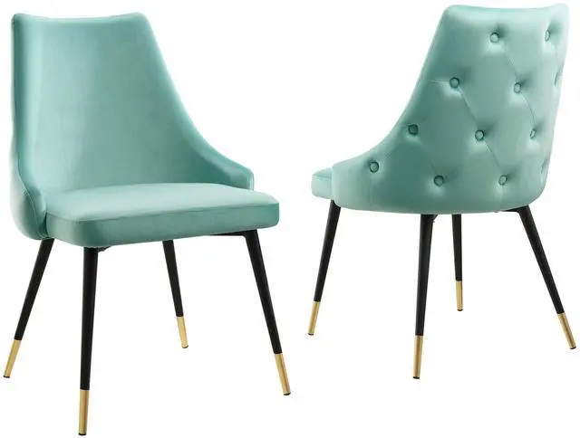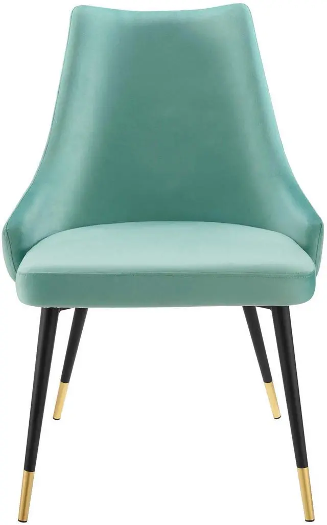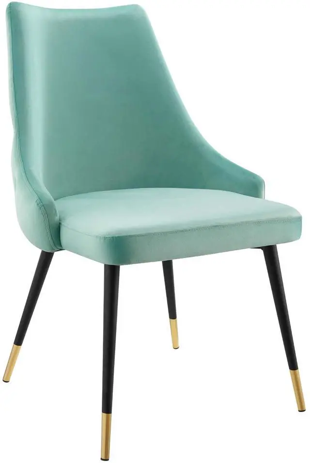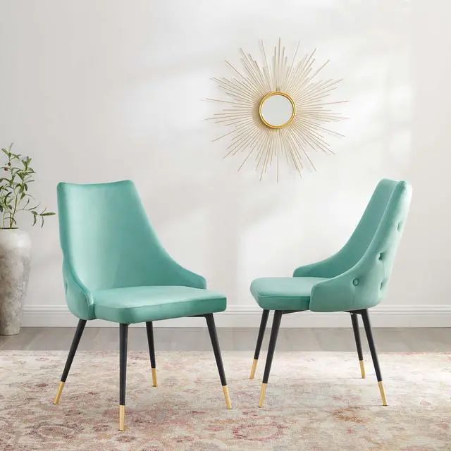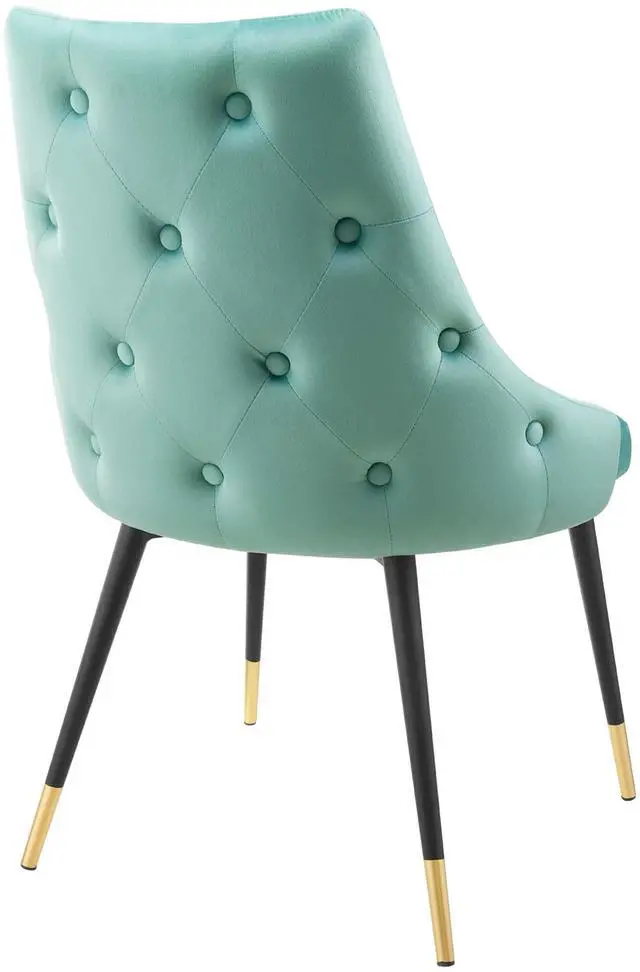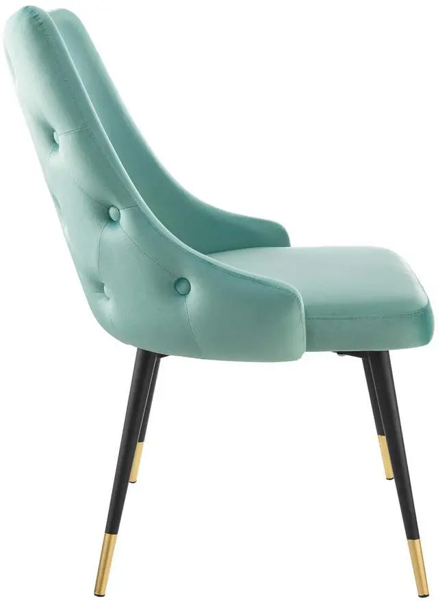 Revitalize dining decor or your living space with the Adorn Tufted Performance Velvet Dining Side Chair. Classic button tufting along the chair's exterior and graceful sweeping lines blend seamlessly into the lush comfort of this dining chair. With soft stain-resistant performance velvet upholstery, this accent chair offers a comfortable place to rest with dense foam padding. Sitting on four black tapered legs with gold foot sleeves, Adorn's versatile vintage modern style and glam deco charm makes this side chair ideally suited for a variety of rooms. Place this velvet chair around the dining table, or use it as an accent chair in the living room, bedroom or entryway, or update your home office seating with use as a cute desk chair.