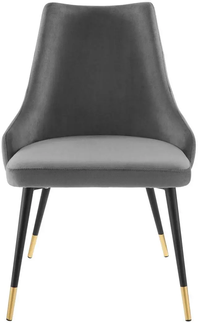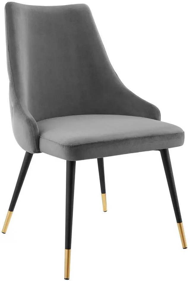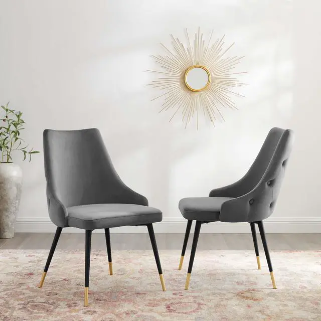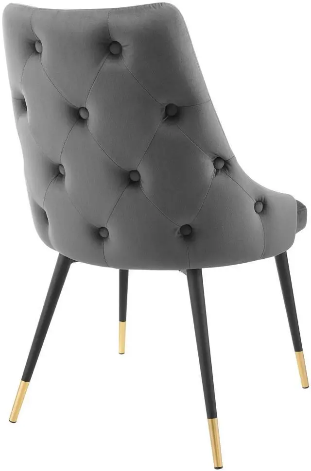Revitalize dining decor or your living space with the Adorn Tufted Performance Velvet Dining Side Chair. Classic button tufting along the chair's exterior and graceful sweeping lines blend seamlessly into the lush comfort of this dining chair. With soft stain-resistant performance velvet upholstery, this accent chair offers a comfortable place to rest with dense foam padding. Sitting on four black tapered legs with gold foot sleeves, Adorn's versatile vintage modern style and glam deco charm makes this side chair ideally suited for a variety of rooms. Place this velvet chair around the dining table, or use it as an accent chair in the living room, bedroom or entryway, or update your home office seating with use as a cute desk chair.