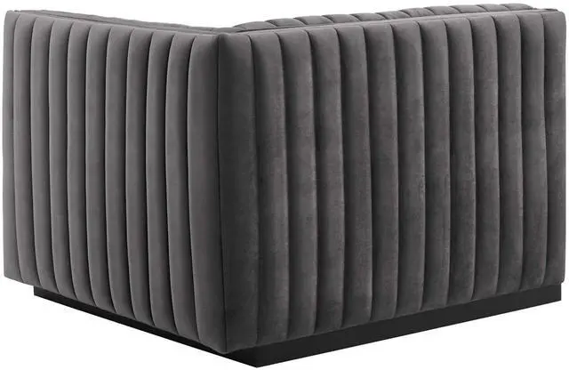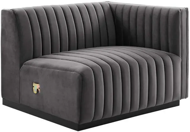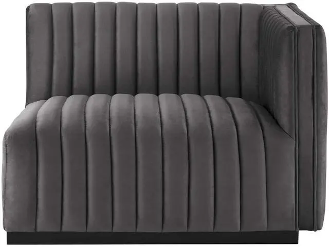 Modern appeal surrounds the Conjure Channel Tufted Performance Velvet Upholstered Right-Arm Chair. Luxuriously soft, stain-resistant performance velvet upholstery covers dense foam padding and an individually wrapped spring coil system for a supportive living room chair that will become the go-to lounge spot for family and friends. Vertical channel tufting and subtle French piping adds depth to this vintage inspired sectional piece that effortlessly becomes the focal point in your living room. Solidly constructed from wood and plywood, this armchair features non-marking foot caps and boasts a matte black base. Versatile and elegant, this sectional sofa piece is ideally suited for a variety of decor styles in your living room, lounge, or home office.