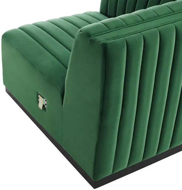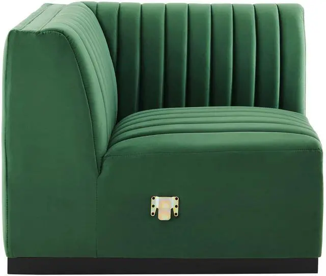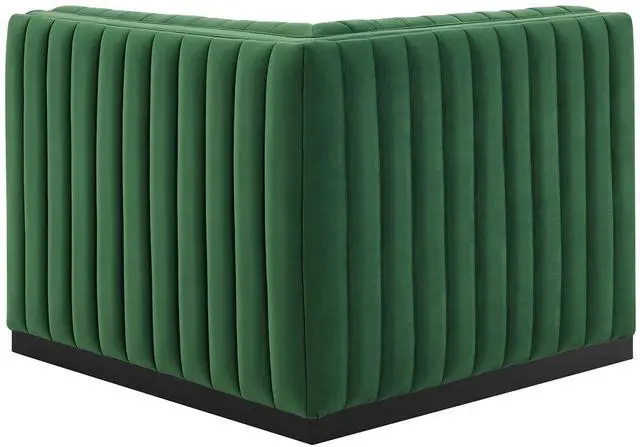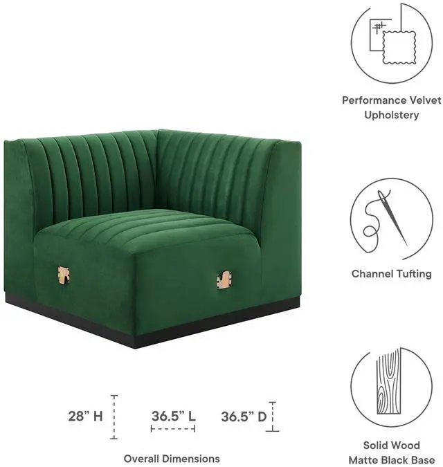Modern appeal surrounds the Conjure Channel Tufted Performance Velvet Upholstered Left Corner Chair. Luxuriously soft, stain-resistant performance velvet upholstery covers dense foam padding and an individually wrapped spring coil system for a supportive living room chair that will become the go-to lounge spot for family and friends. Vertical channel tufting and subtle French piping adds depth to this vintage inspired sectional piece that effortlessly becomes the focal point in your living room. Solidly constructed from wood and plywood, this corner chair features non-marking foot caps and boasts a matte black base. Versatile and elegant, this sectional sofa piece is ideally suited for a variety of decor styles in your living room, lounge, or home office.