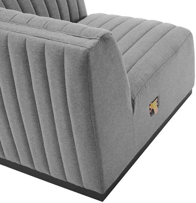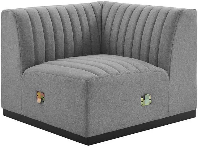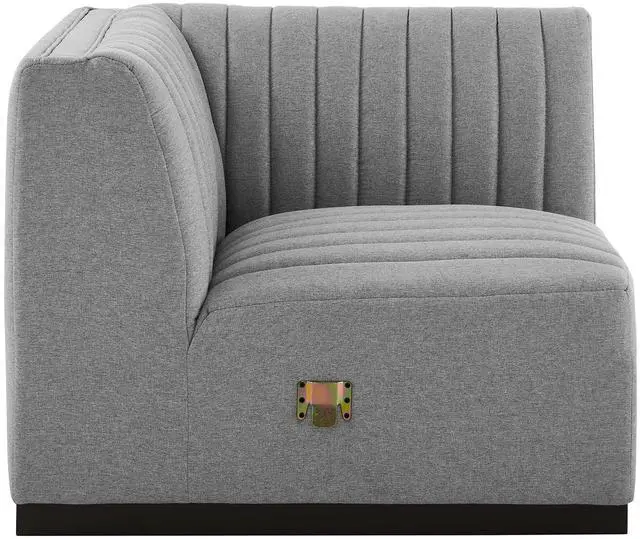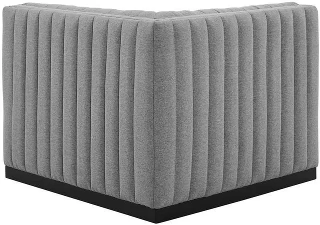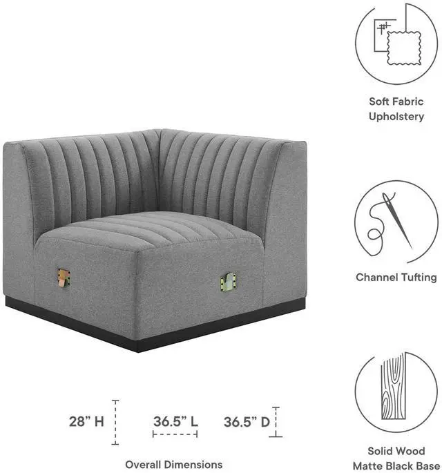 Modern appeal surrounds the Conjure Channel Tufted Upholstered Fabric Right Corner Chair. Soft and durable fabric upholstery covers dense foam padding and an individually wrapped spring coil system for a supportive living room chair that will become the go-to lounge spot for family and friends. Vertical channel tufting and subtle French piping adds depth to this vintage inspired sectional piece that effortlessly becomes the focal point in your living room. Solidly constructed from wood and plywood, this corner chair features non-marking foot caps and boasts a matte black base. Versatile and elegant, this sectional sofa piece is ideally suited for a variety of decor styles in your living room, lounge, or home office.