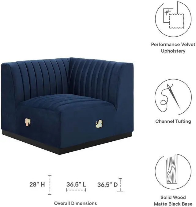 Modern appeal surrounds the Conjure Channel Tufted Performance Velvet Upholstered Left Corner Chair. Luxuriously soft, stain-resistant performance velvet upholstery covers dense foam padding and an individually wrapped spring coil system for a supportive living room chair that will become the go-to lounge spot for family and friends. Vertical channel tufting and subtle French piping adds depth to this vintage inspired sectional piece that effortlessly becomes the focal point in your living room. Solidly constructed from wood and plywood, this corner chair features non-marking foot caps and boasts a matte black base. Versatile and elegant, this sectional sofa piece is ideally suited for a variety of decor styles in your living room, lounge, or home office.