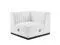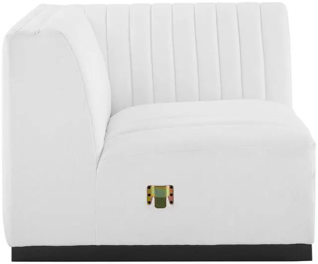 Modern appeal surrounds the Conjure Channel Tufted Upholstered Fabric Right Corner Chair. Soft and durable fabric upholstery covers dense foam padding and an individually wrapped spring coil system for a supportive living room chair that will become the go-to lounge spot for family and friends. Vertical channel tufting and subtle French piping adds depth to this vintage inspired sectional piece that effortlessly becomes the focal point in your living room. Solidly constructed from wood and plywood, this corner chair features non-marking foot caps and boasts a matte black base. Versatile and elegant, this sectional sofa piece is ideally suited for a variety of decor styles in your living room, lounge, or home office.