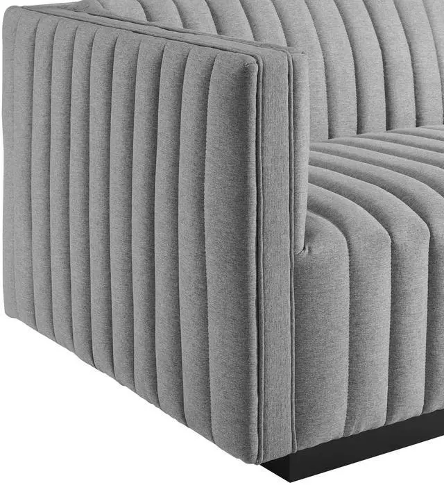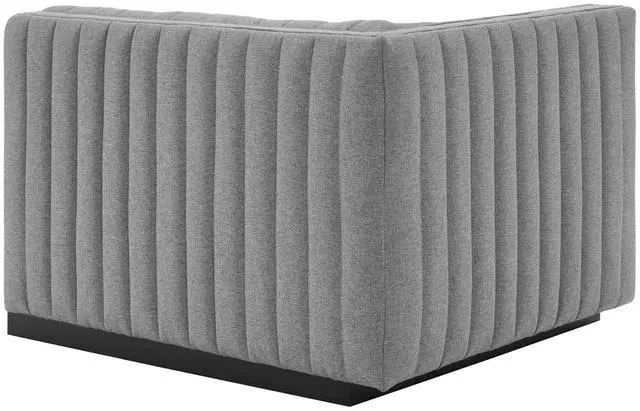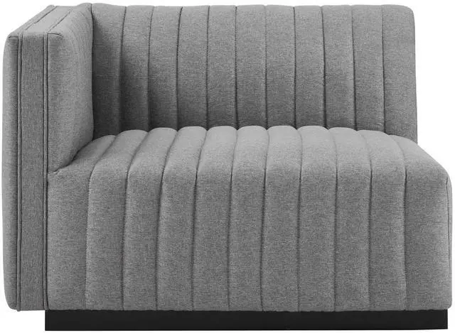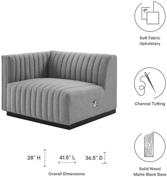 Modern appeal surrounds the Conjure Channel Tufted Upholstered Fabric Left-Arm Chair. Soft and durable fabric upholstery covers dense foam padding and an individually wrapped spring coil system for a supportive living room chair that will become the go-to lounge spot for family and friends. Vertical channel tufting and subtle French piping adds depth to this vintage inspired sectional piece that effortlessly becomes the focal point in your living room. Solidly constructed from wood and plywood, this armchair features non-marking foot caps and boasts a matte black base. Versatile and elegant, this sectional sofa piece is ideally suited for a variety of decor styles in your living room, lounge, or home office.