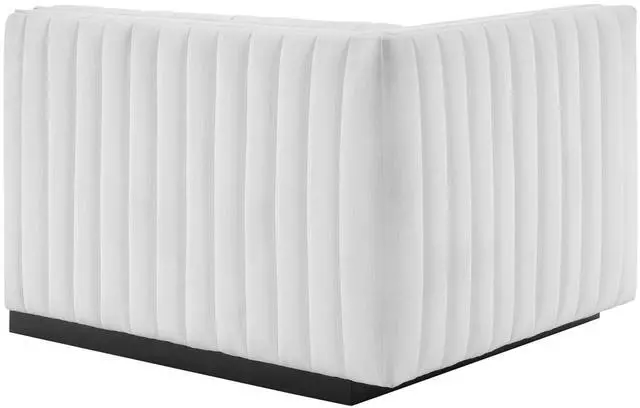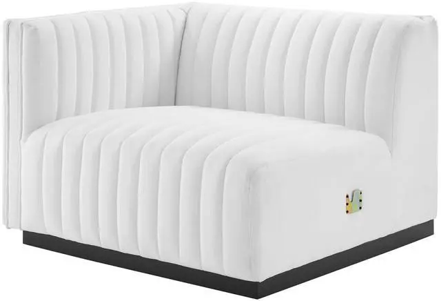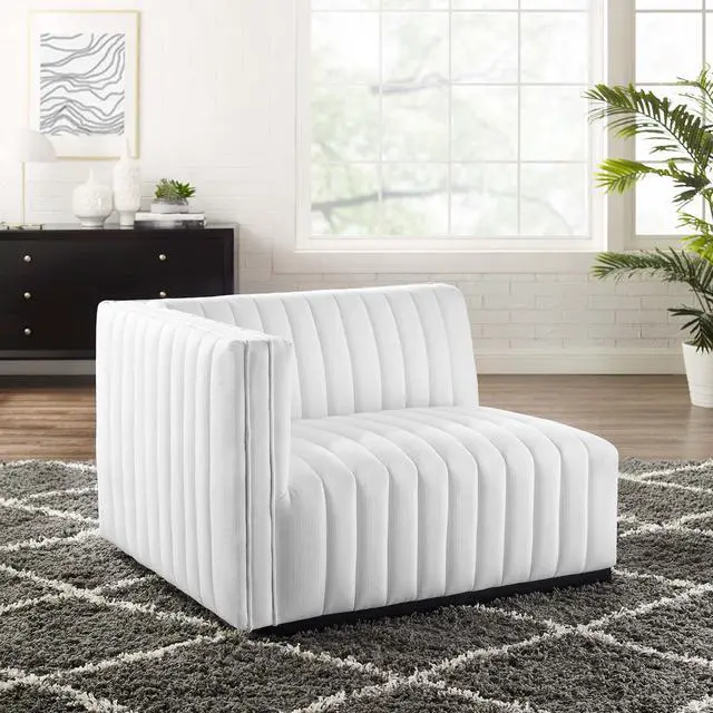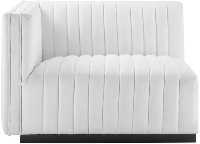 Modern appeal surrounds the Conjure Channel Tufted Upholstered Fabric Left-Arm Chair. Soft and durable fabric upholstery covers dense foam padding and an individually wrapped spring coil system for a supportive living room chair that will become the go-to lounge spot for family and friends. Vertical channel tufting and subtle French piping adds depth to this vintage inspired sectional piece that effortlessly becomes the focal point in your living room. Solidly constructed from wood and plywood, this armchair features non-marking foot caps and boasts a matte black base. Versatile and elegant, this sectional sofa piece is ideally suited for a variety of decor styles in your living room, lounge, or home office.