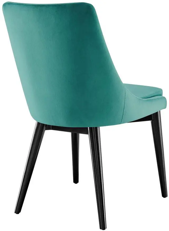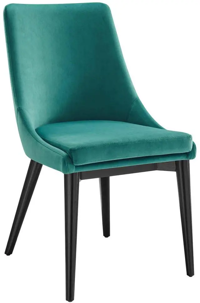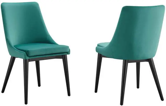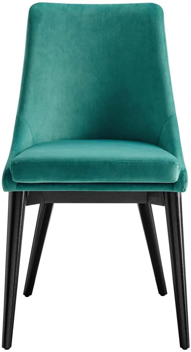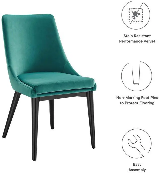 Revitalize your dining decor with the Viscount Dining Chairs - Set of 2. Graceful, minimalist lines blend seamlessly with the lush comfort of Viscount which features soft, stain-resistant performance velvet upholstery, dense foam padding, and black rubberwood tapered legs. Viscount's versatile vintage modern style make this set ideally suited for a variety of rooms. Place Viscount in the dining room or kitchen as dining chairs, or in the living room, entryway, or bedroom as accent chairs. This modern accent dining chair supports up to 300 lbs. and includes non-marking foot caps to protect flooring.