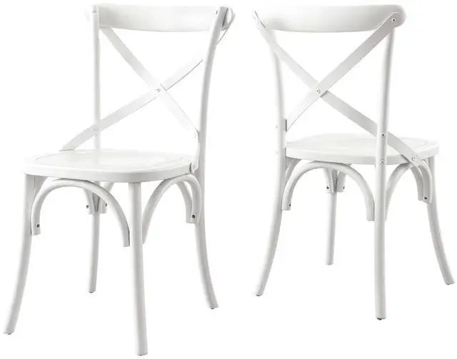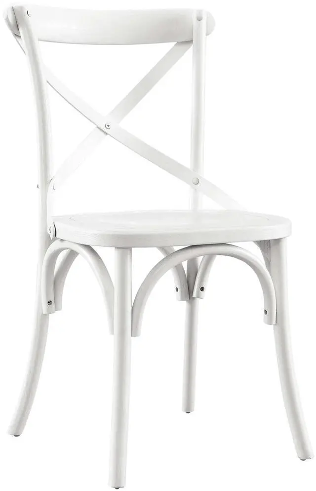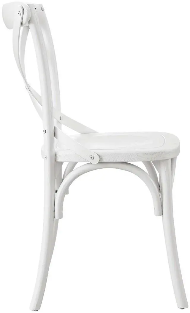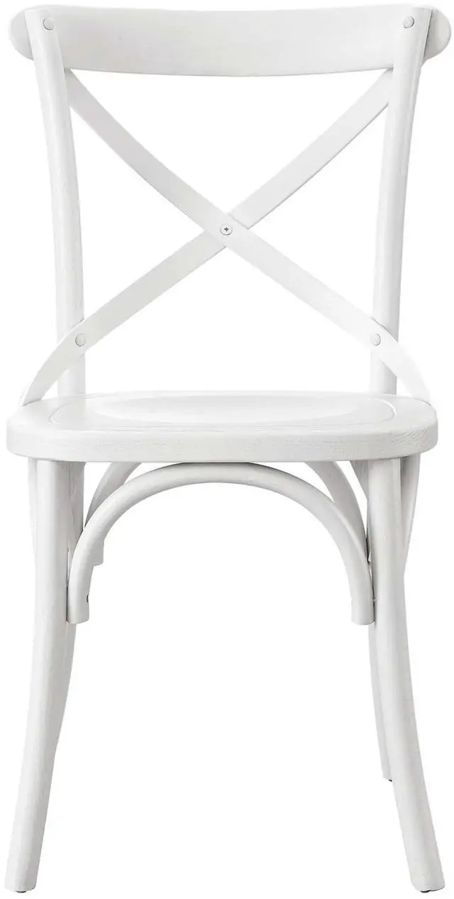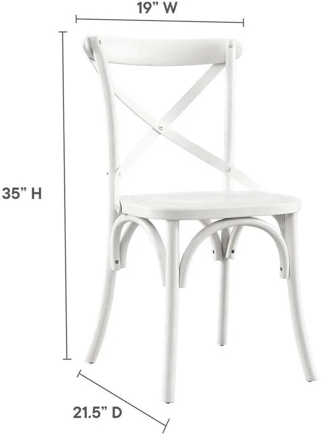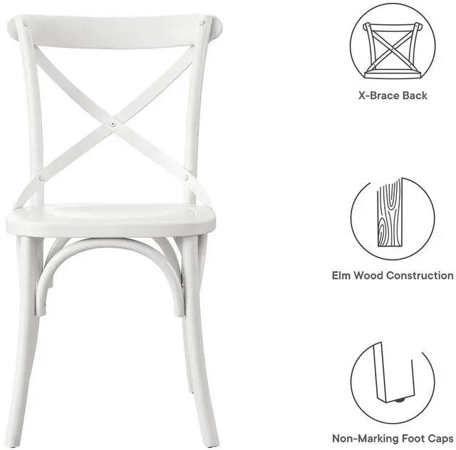 Introduce feelings of nostalgia as you gather around the dining table for a quick breakfast or dinner with friends with the Gear Dining Side Chair. Blending farmhouse charm with modern style, this dining chair features an X-brace back and stretchers between splayed legs. With non-marking foot caps to protect flooring, this side chair is durably crafted with durable elm wood for a sturdy construction built to last. Make a statement in your dining space or kitchen nook with this versatile wood dining chair that can also be used as an accent chair in a living room or desk chair in a home office.