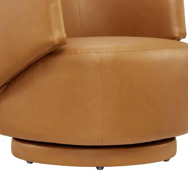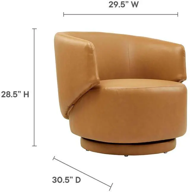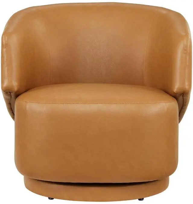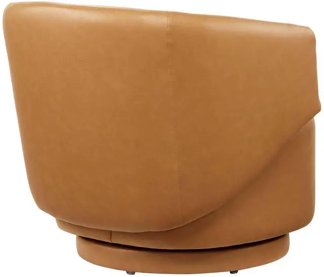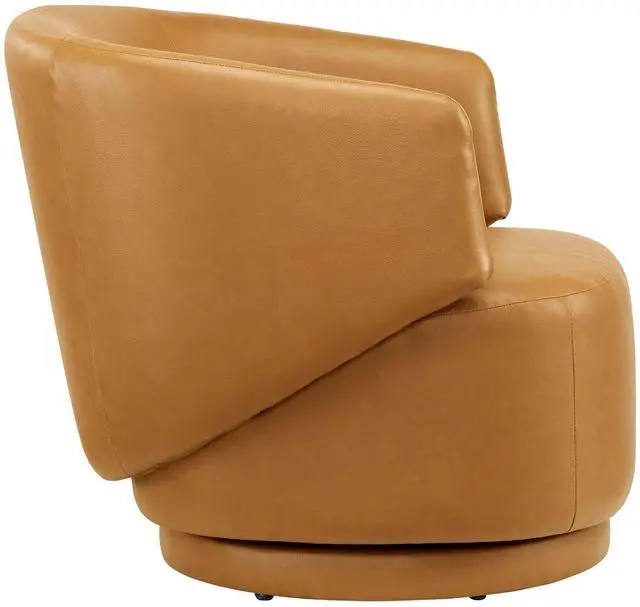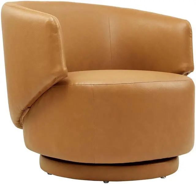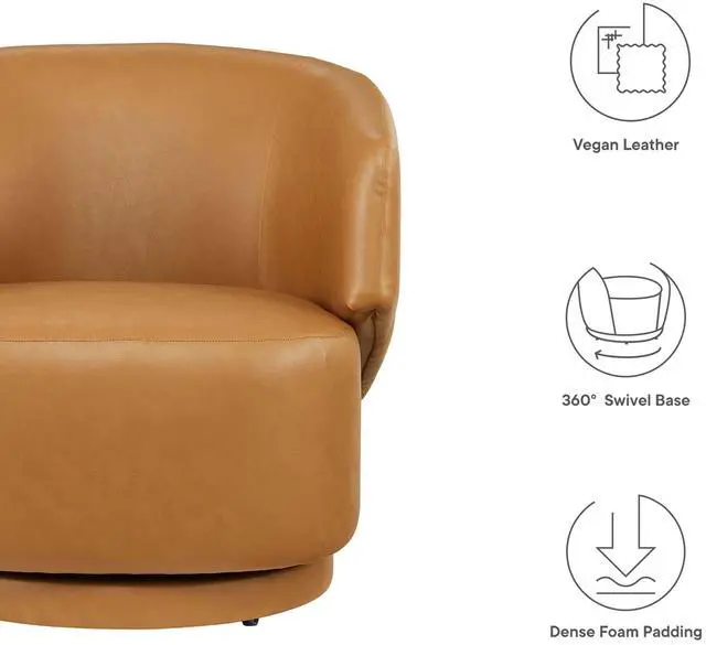 Introduce appreciated texture to a living room, entryway, bedroom, office, or other seating area with the Celestia Vegan Leather Swivel Chair. Featuring a curved silhouette with angular details, this accent chair abounds in luxe modern style. This swivel chair is upholstered in vegan leather that boasts a smooth, luxurious look. Dense foam padding offers a premium seating experience while the swivel base allows this vegan leather chair to effortlessly rotate to suit the needs of the moment. Comes fully assembled.