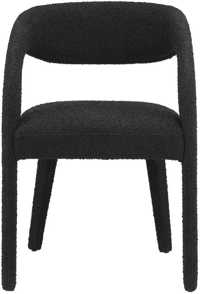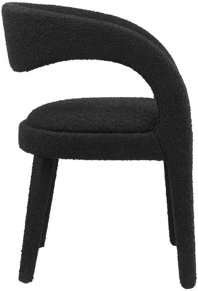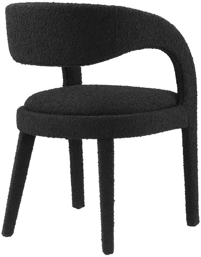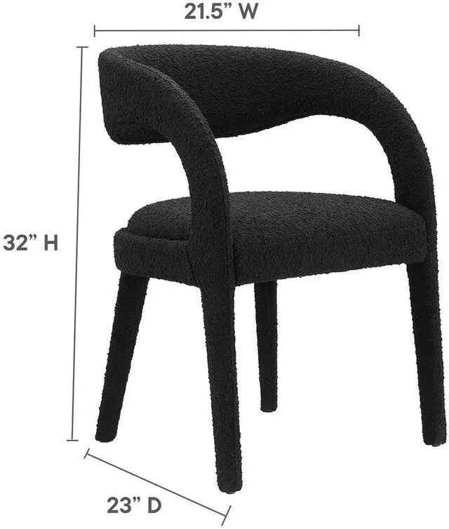 Experience the perfect blend of modern sophistication and luxurious comfort with the Pinnacle Boucle Upholstered Dining Chair Set of Two. The distinct silhouette showcases a curved backrest and an open design that effortlessly enhances your dining or living space with luxe style. This dining chair set indulges your senses with its dense foam padding, upholstered in a tactile, nubby textured boucle fabric. Non-marking plastic foot pins ensure your flooring remains free from scuffs and scratches. With minimal assembly needed, this set not only offers a stylish statement but also a hassle-free setup.
