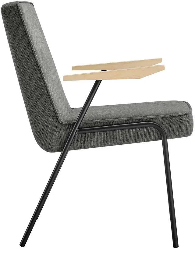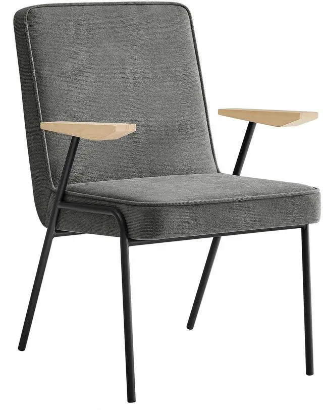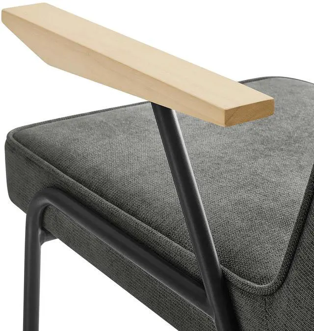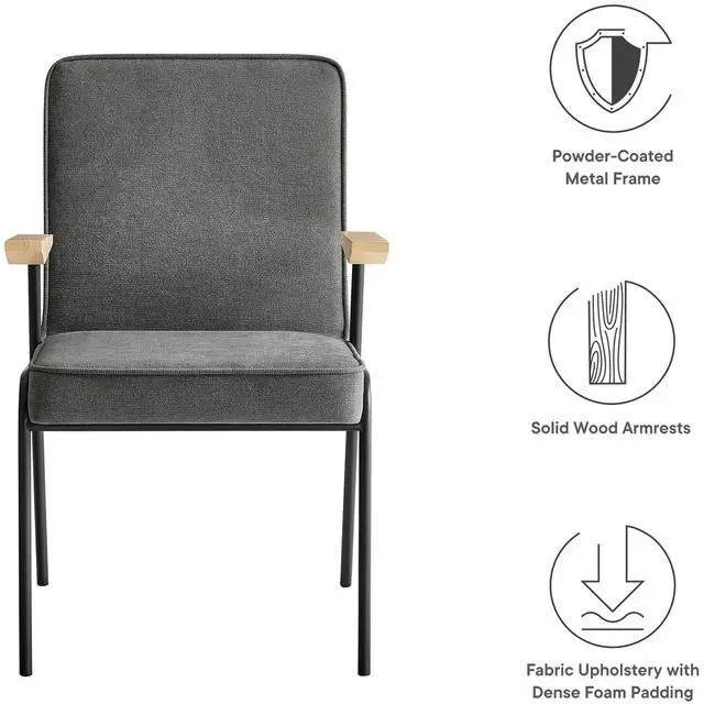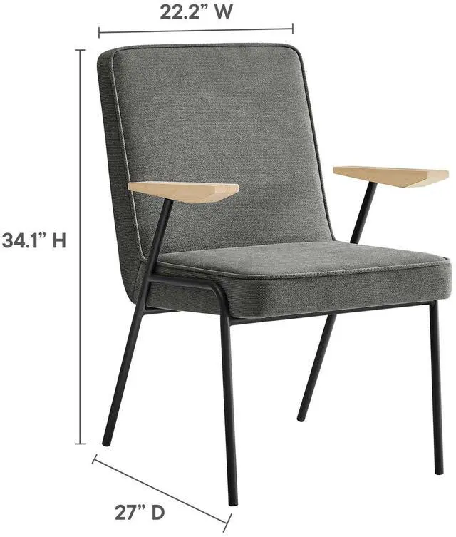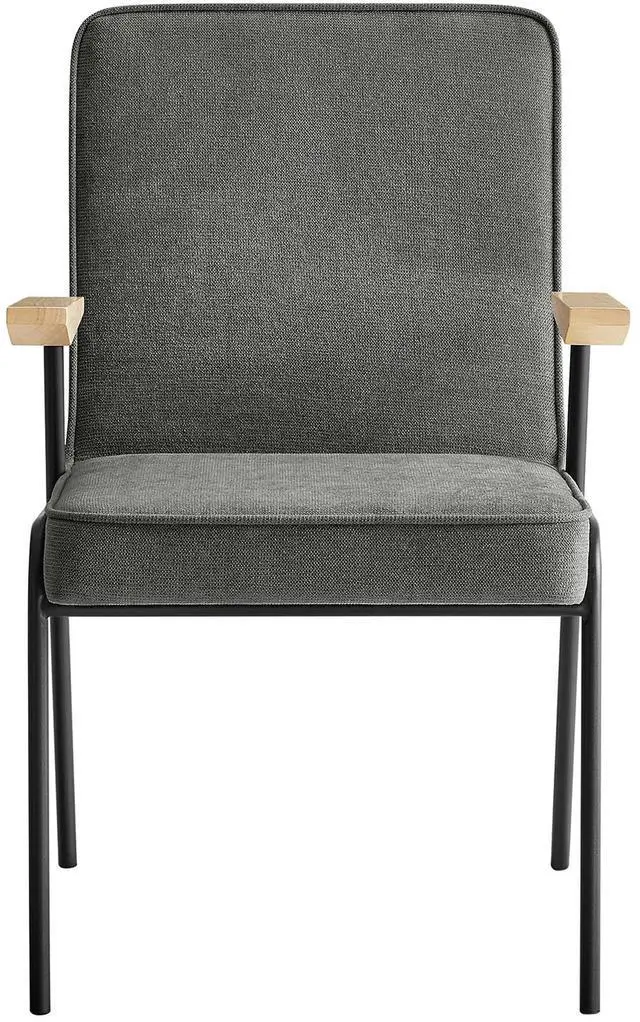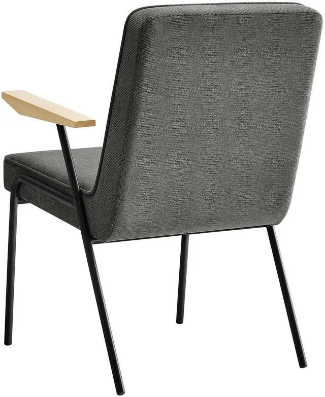 Perfect for various settings in the dining room or living room, the Vista Dining Chair offers a seamless blend of functionality and style. Its powder-coated metal frame grants durability, while the wooden arms add a touch of warmth, epitomizing mid-century modern flair. This metal and wood armchair has an upholstered fabric seat, complete with dense foam padding, French piping trim, and a comfortable recline, inviting you to sit back and relax. Equipped with non-marking foot glides, the Vista upholstered dining chair with arms protects your floors from scratches.