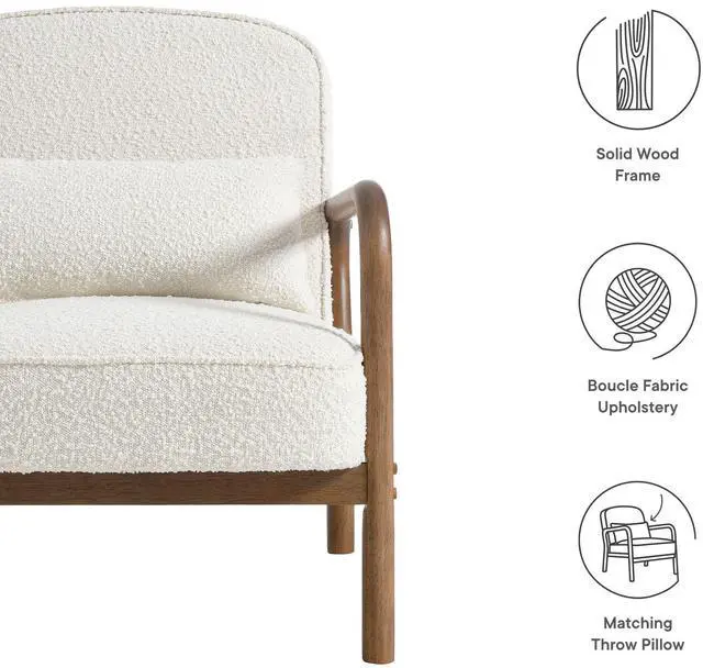 Experience the perfect blend of comfort and timeless style with the Charlie Boucle Chair, a piece of living room furniture that merges mid-century modern elegance with contemporary allure. Crafted with a solid wood frame and dense foam padding on the seat and backrest, this boucle upholstered armchair offers a luxurious seating experience that makes it an irresistible addition to any living room or cozy reading nook. The rounded armrests enhance its aesthetic appeal and also provide extra comfort, making it the perfect modern accent chair for relaxing. Complete with a matching throw pillow for added support, this boucle armchair is not just a comfy reading chair it's a statement of style.