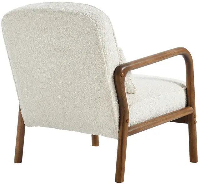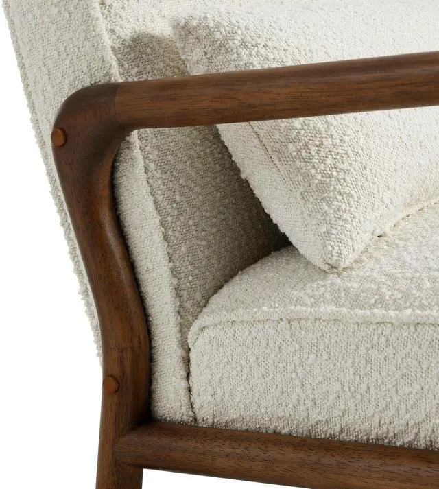 Ideal for those seeking a mid-century modern accent chair, the Charlie Living Room Chair enriches any space with its textured boucle upholstery and curved wooden armrests. Includes felt pads to protect flooring. Assembly required.