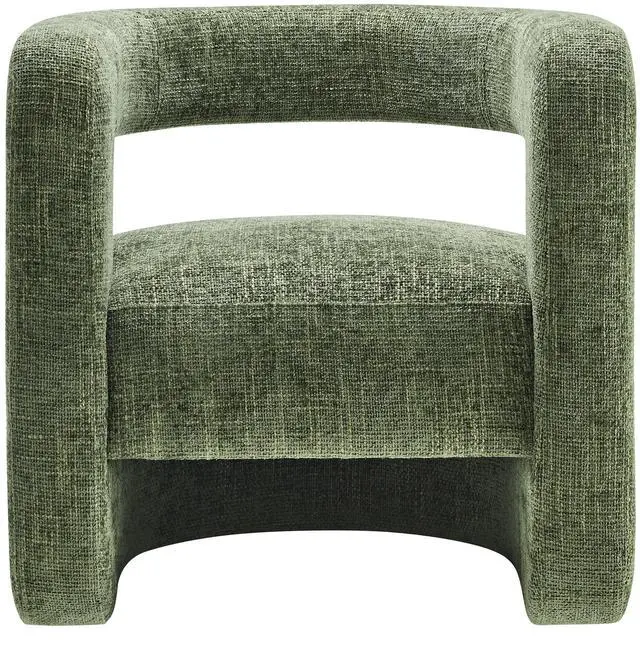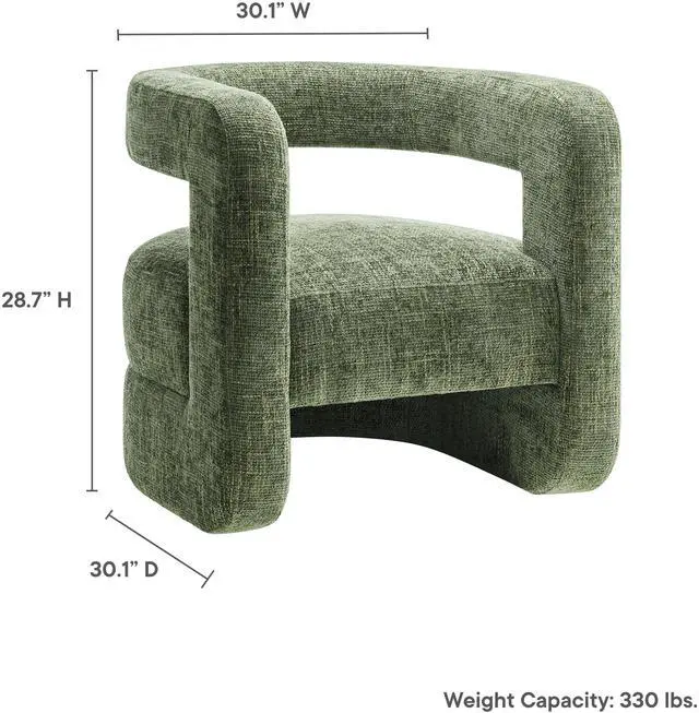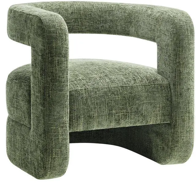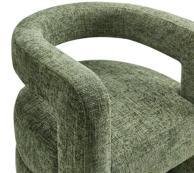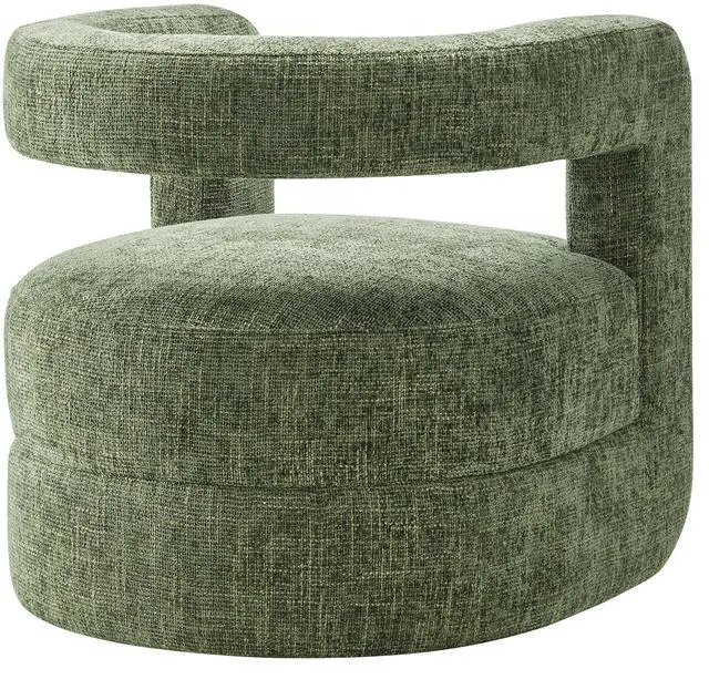Redefine your decor with the chic and contemporary Jaylin Chenille Accent Chair. Its striking U-shaped frame makes this unique barrel chair an eye-catching addition to any space. The open-back design and thick, curved arms create a distinctive floating appearance that is both contemporary and inviting, while its plush circular seat nestles perfectly within the rounded frame. Padded with dense foam and covered in luxurious chenille fabric, this wide armchair has sinuous spring support, for a durable and cozy seating experience. Featuring non-marking foot pins that protect your floors, this round accent chair arrives fully assembled.