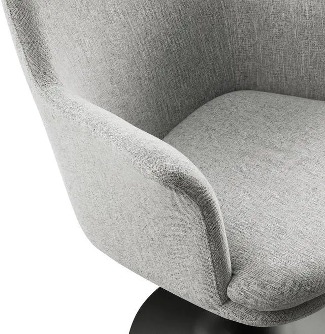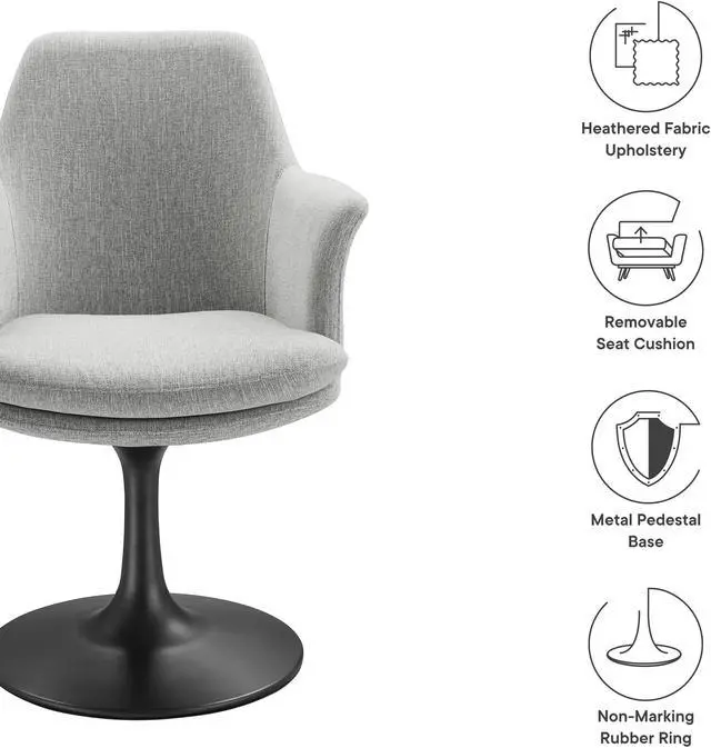 Embrace the day-to-day with the Lippa Swivel Dining Room Armchair. Upholstered in textured woven heathered fabric, this swivel armchair combines style and comfort and is perfect for everyday use. Resting on a tapered, metal pedestal base, the Lippa fabric dining armchair not only exudes modern elegance but also features a 360º swivel capability and a slightly reclined back. Add to this its gracefully curved arms that flow into the backrest, and this pedestal swivel chair provides comfortable support, making it perfect for both casual dining and relaxed conversation. The removable and washable seat cushion, secured with velcro strips, adds practicality to the swivel dining chair design, while a plastic rubber ring around the base protects floors from scratches.