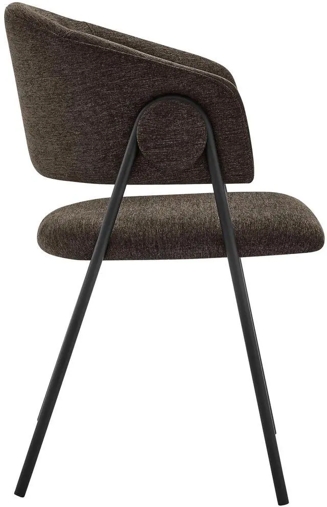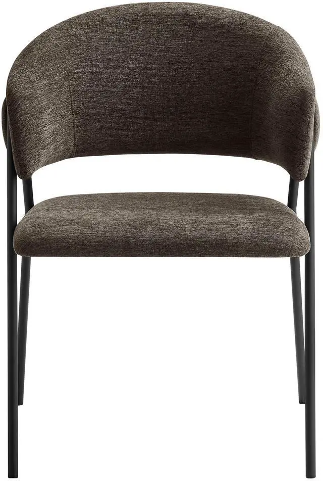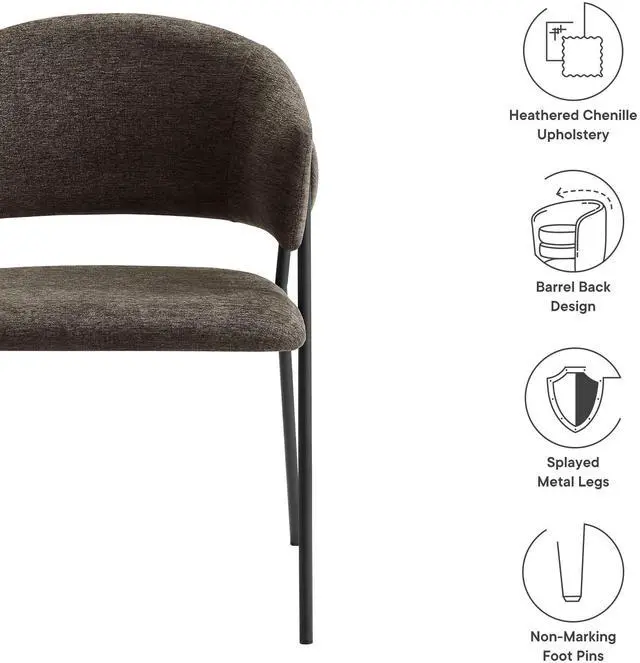 Meet Nellaa pair of dining room accent chairs that blend vintage charm with versatile functionality. The seat and backrest on these padded chairs are each elegantly upholstered in heathered chenille fabric and feature a stylish gap between them, shaping the elegant contour of an open back armchair. This set of 2 barrel dining chairs stand on splayed metal legs that gracefully ascend and curve around a decorative round button, enhancing the club chair's retro aesthetic. Each leg is thoughtfully finished with foot pins to protect your floors, ensuring practicality complements style. The Nella Chenille Upholstered kitchen table chairs do require assembly but simple instructions are included, so you can have these comfy dining chairs set up in no time.