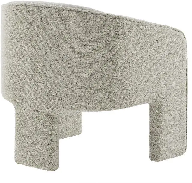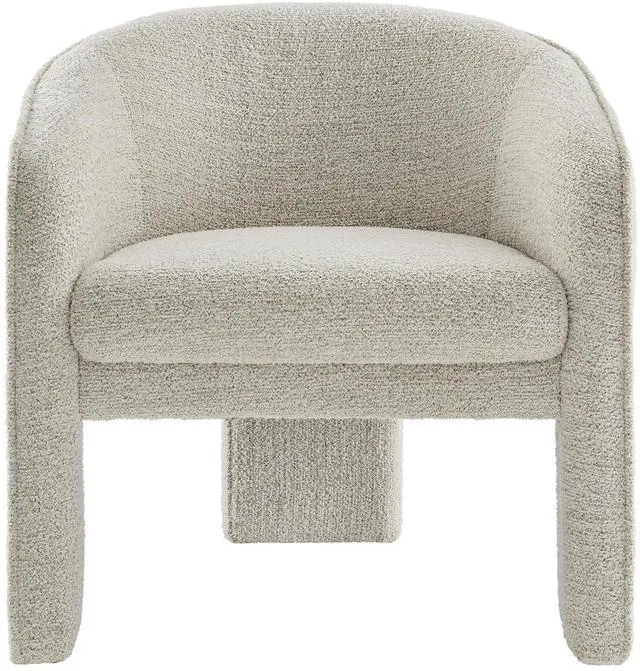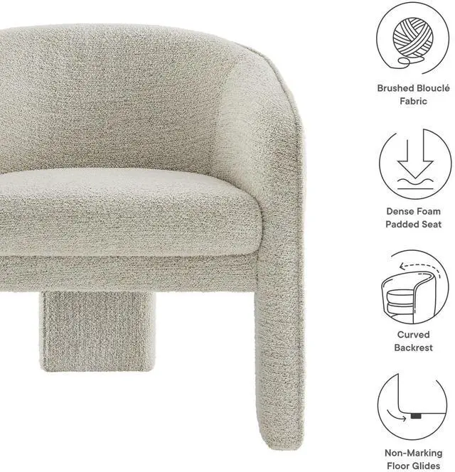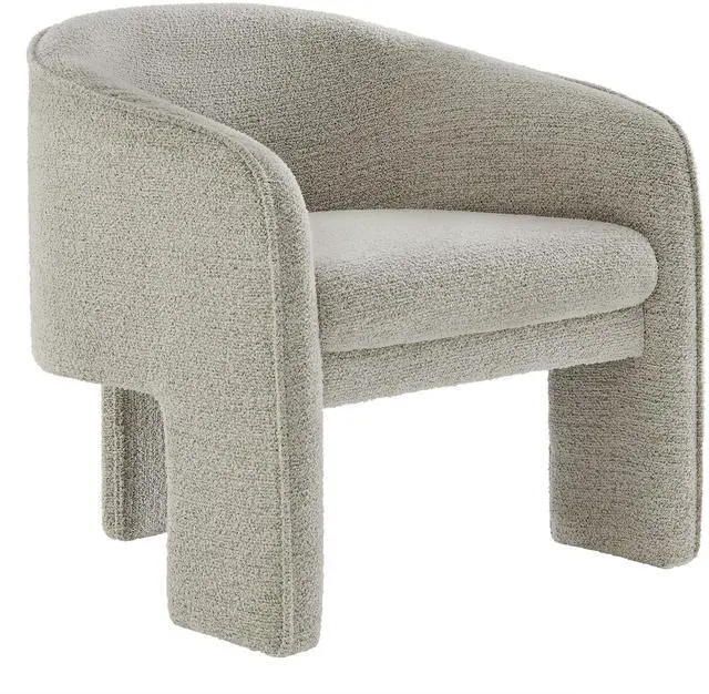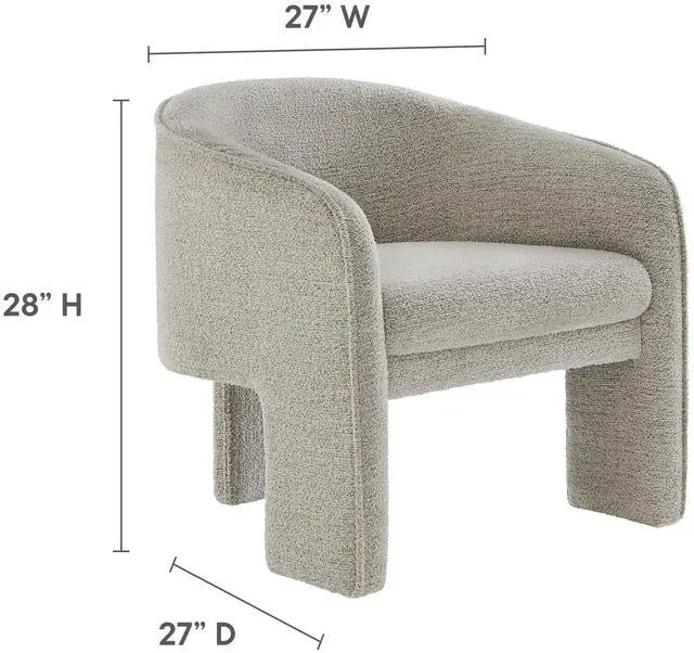 Distinctive and bold, the Greer Comfy Barrel Accent Chair with 3 Legs offers a fresh take on modern seating. Upholstered in soft boucle fabric, this upholstered living room chair features a barrel chair silhouette with a unique three-legged design that sets it apart. Its curved back flows into the gently angled arms, creating a cocoon-like seating experience that's as comfortable as it is stylish. With padding throughout, the Greer Accent Armchair provides a cozy place to relax or dine. Perfect for small spaces or as a statement-making wide dining chair, the lower backrest adds to its sleek, modern look.