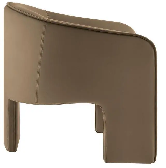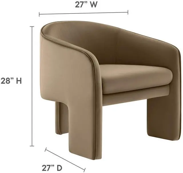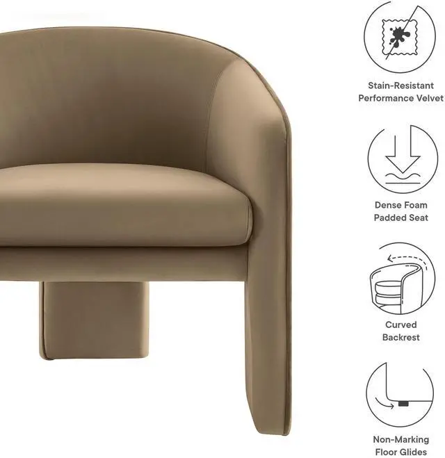 Distinctive and bold, the Greer Performance Velvet Accent Chair offers a fresh take on modern seating. Covered in stain-resistant performance velvet, this soft upholstered reading armchair features a barrel chair silhouette with a unique three-legged design that sets it apart. Its curved back flows into the gently angled arms, creating a cocoon-like seating experience that's as comfortable as it is stylish. With padding throughout, the Greer Velvet Armchair provides a cozy place to relax or dine. Perfect for small spaces or as a wide velvet dining chair, the lower backrest adds to its sleek, modern look.