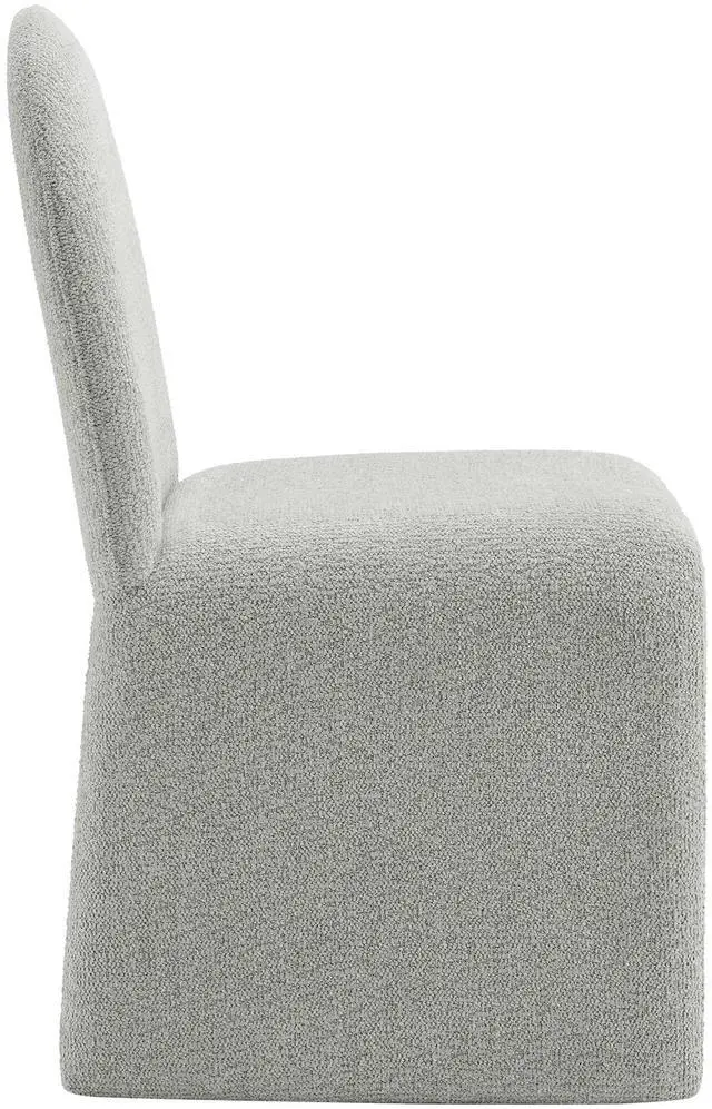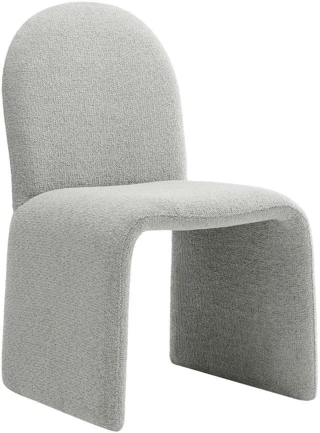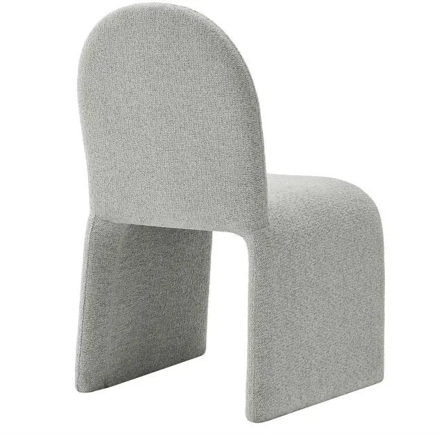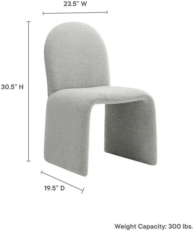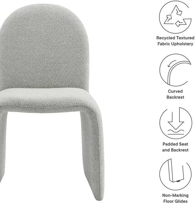 A harmonious blend of modern elegance and sleek design, the Junia Armless Dining Chair captivates with its sculptural silhouette and soft, textural allure. Featuring a rounded arch high backrest and a continuous frame with a waterfall edge, this inspired slipper dining chair is fully padded and upholstered in boucle fabric, offering a tactile charm and inviting comfort. Made from recycled plastic bottles, the upholstery fabric is also OEKO-TEX® STANDARD 100 certified. The gentle curves and armless design make it a sophisticated addition to dining rooms, living spaces, office desks, or bedrooms.