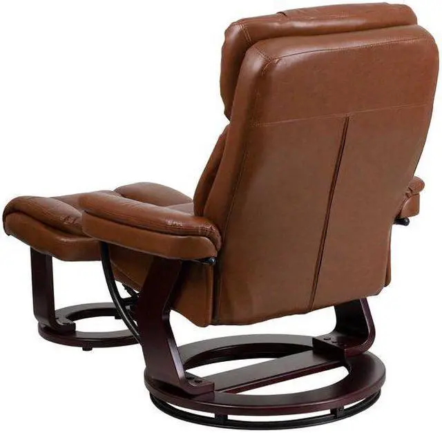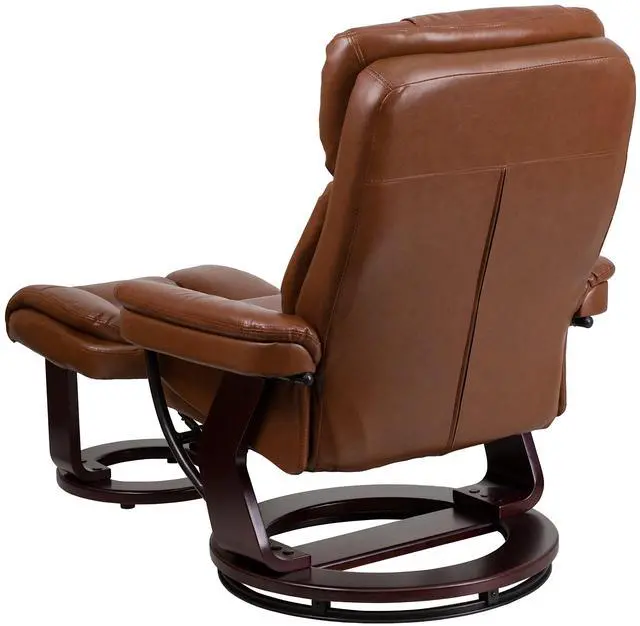Contemporary Multi-Position Recliner and Curved Ottoman with Swivel Mahogany Wood Base in Brown Vintage LeatherSoft