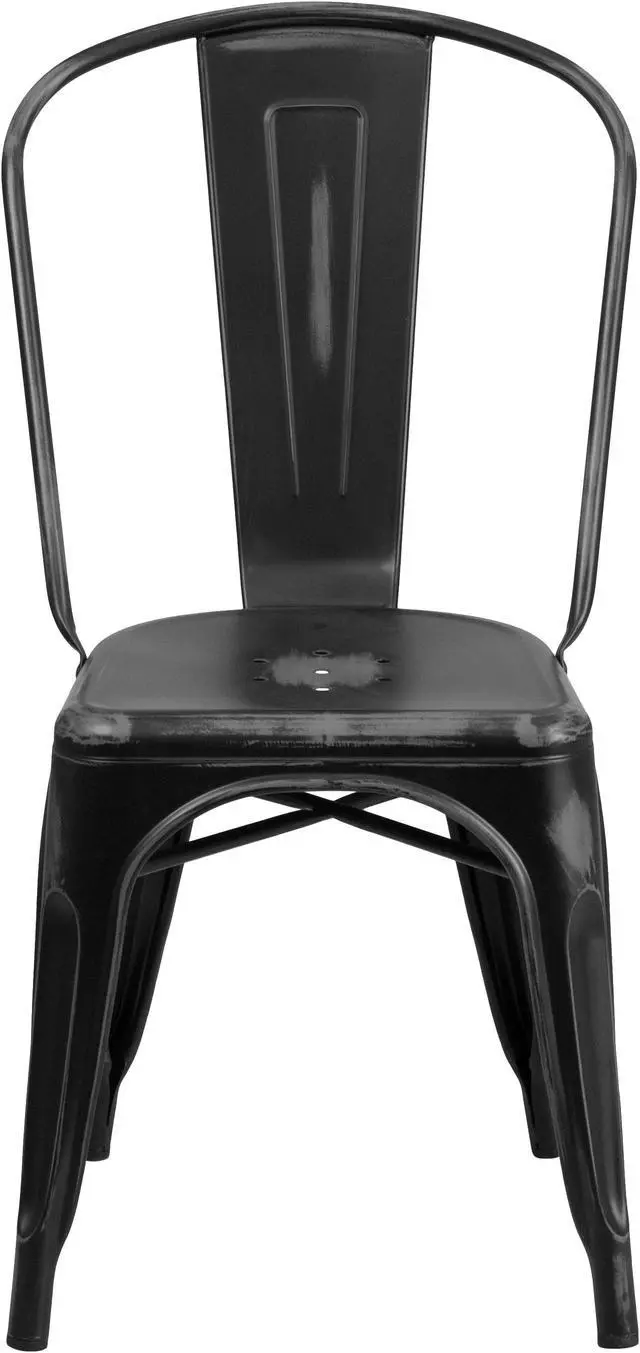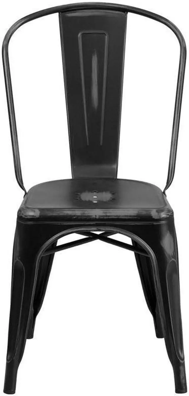 The distressed metal chair features a curved back with a vertical slat along with a stabilizing cross brace. Your colorful dining chair will last longer thanks to the plastic bumper guards that protect the chairs' finish when stacked. While being used outside on the deck, pool or patio, you'll be delighted to find that these outdoor stacking chairs include drain holes to prevent pooling in the center of the seat. This translates to quicker seating turnaround times in your busy establishment. This trend-setting indoor outdoor dining chair will make a great addition to your kitchen, dining room or restaurant.