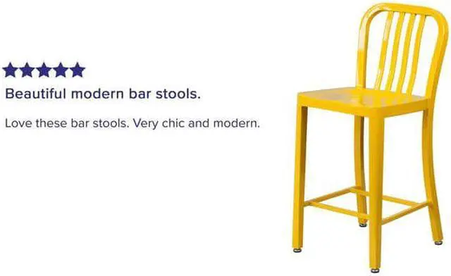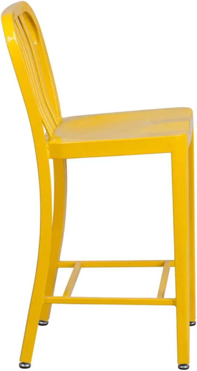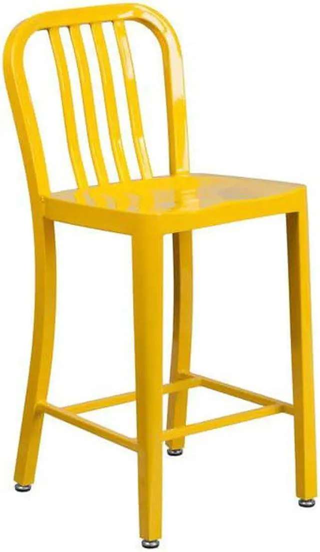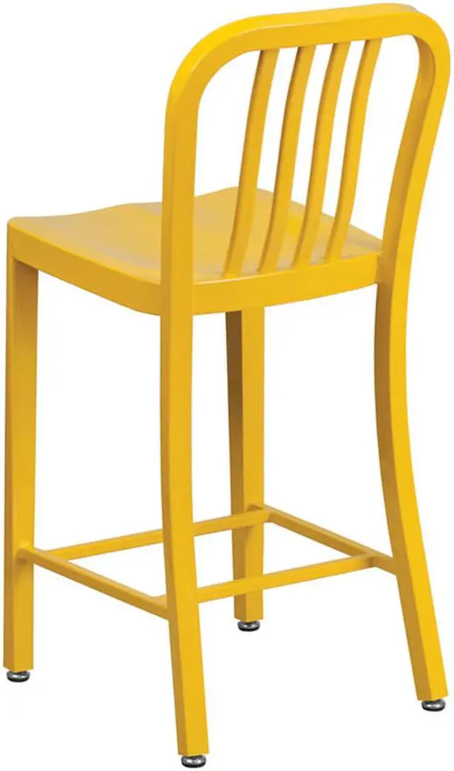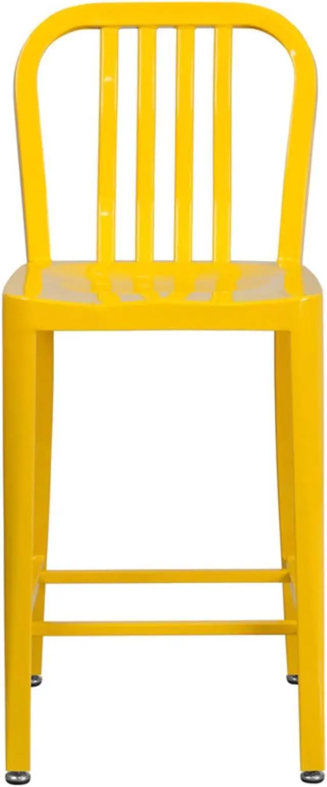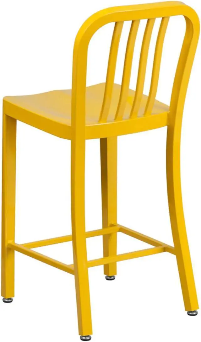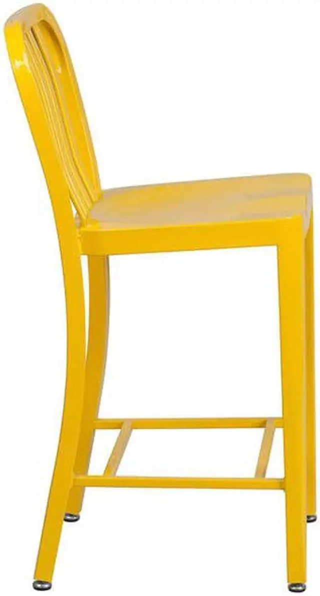 Invite family and friends over to hang out at your home bar on these comfortable colorful metal dining stools. Bring outdoors to enjoy the warm weather on your patio while sitting around your counter height fire pit table. The versatile 24" bar stool will look great in any environment: kitchen, restaurants, bars, bistros, or your local greasy spoon. If you're looking for a trendy stool for your restaurant that will hold its style throughout the years, this colorful restaurant counter height bar stool will not disappoint. Crafted from durable galvanized steel metal polished in a glossy finish, this yellow metal stool with back was designed to withstand regular use in the fast-paced restaurant industry. Patrons have a suitable resting place for their feet for comfort counter height table doesn't include a footrest. Uneven floors are no problem with adjustable screw leveling floor glides. Pair these kitchen stools with our matching yellow metal chairs and bar stools to have seating at your dining table, kitchen island and home bar. Coordinate the seating in your restaurant with the same style of seating at your bar and restaurant tables. These counter height chairs can be used year-round outside, for longevity protect the frame from long periods of wet weather.