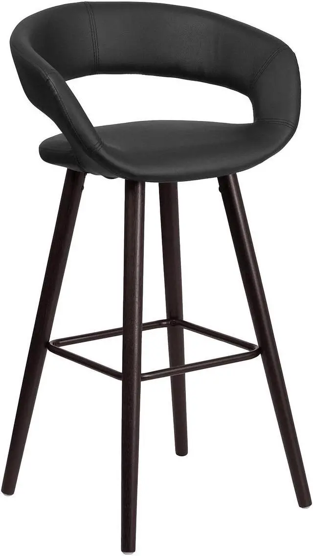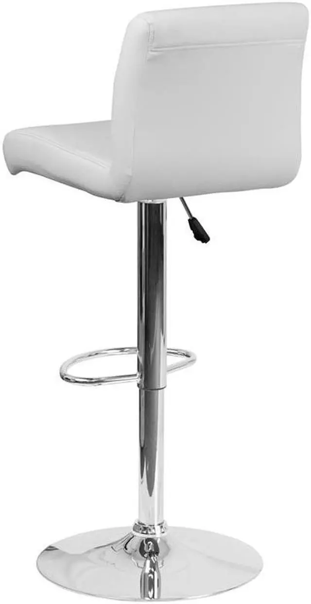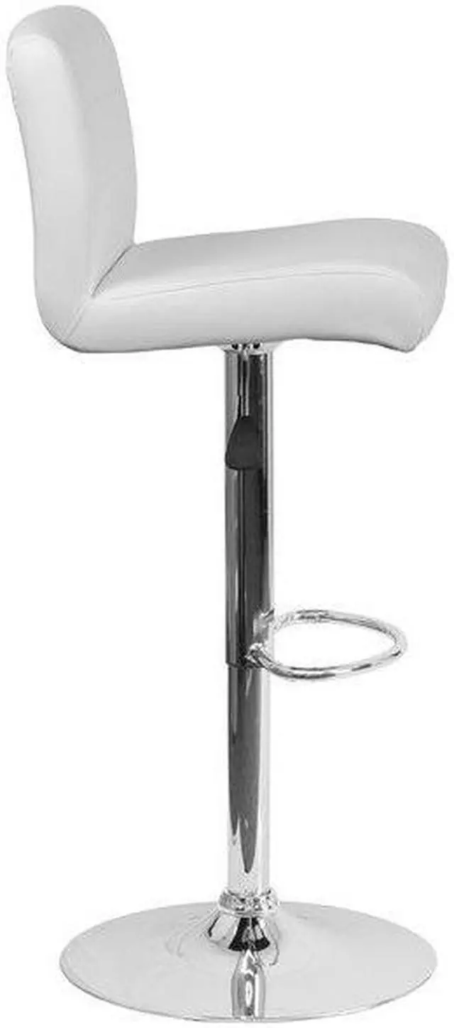 Come in and sit a while in this splendid white adjustable height barstool with exposed embellished stitching on the back. This stylish stool provides added comfort with the waterfall front seat, which is designed to remove pressure from the lower legs and improve circulation. The easy to clean vinyl upholstery is an added bonus when stool is used regularly. The height adjustable swivel seat adjusts from counter to bar height with the handle located below the seat. The chrome footrest supports your feet while also providing a contemporary chic design. To help protect your floors, the base features an embedded plastic ring.