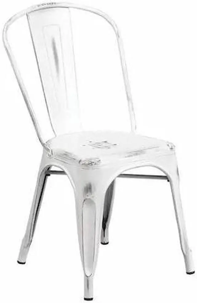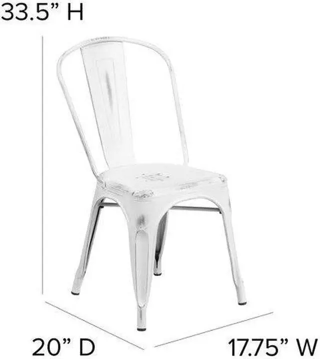 The distressed metal chair features a curved back with a vertical slat along with a stabilizing cross brace. Your colorful dining chair will last longer thanks to the plastic bumper guards that protect the chairs' finish when stacked. While being used outside on the deck, pool or patio, you'll be delighted to find that these outdoor stacking chairs include drain holes to prevent pooling in the center of the seat. This translates to quicker seating turnaround times in your busy establishment. This trend-setting indoor outdoor dining chair will make a great addition to your kitchen, dining room or restaurant.