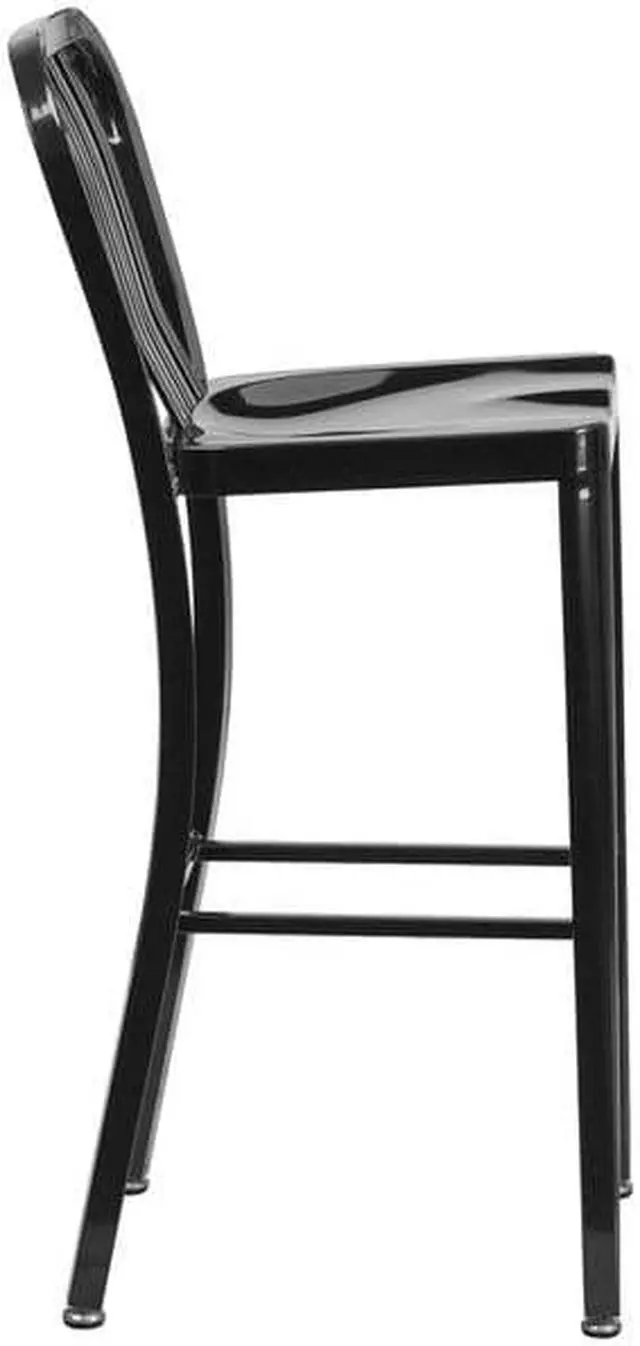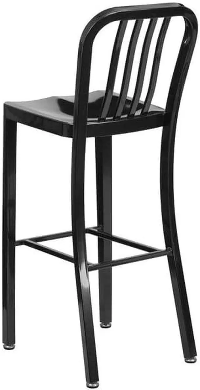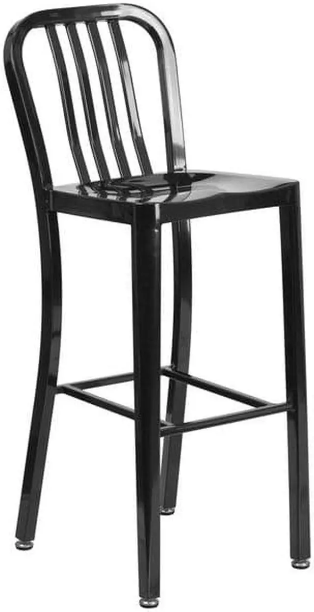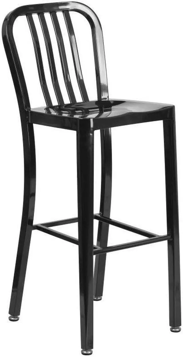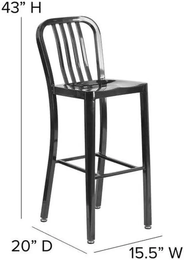 Bar Stool, Overall Height 43 in, Overall Width 15 1/2 in, Overall Depth 20 in, Seat Width 15 1/2 in, Seat Depth 14 in, Back Height 13 3/4 in, Back Width 15 1/2 in, Seat Color Black, Back Color Black, Frame Color Black, Seat Material Metal, Back Material Metal, Frame Material Metal, Unassembled, Arm Style Armless, Weight Capacity 500 lb