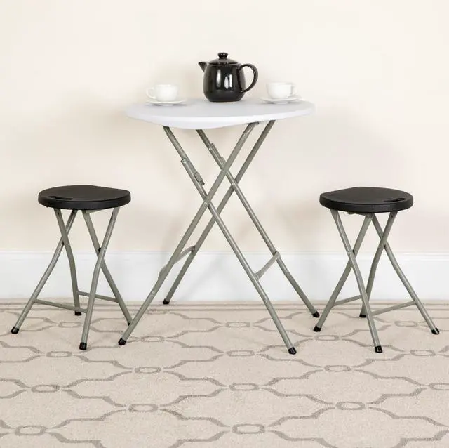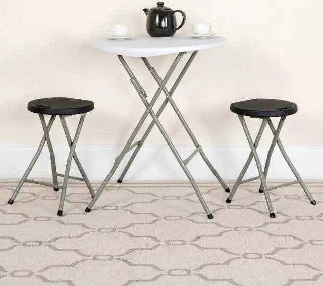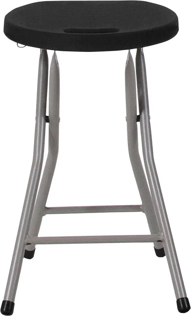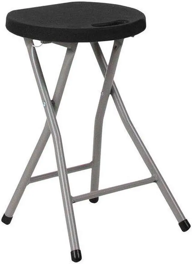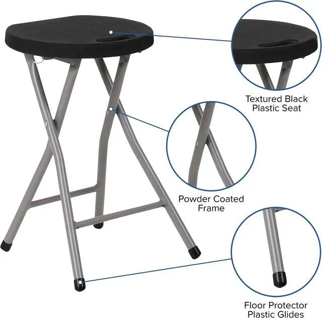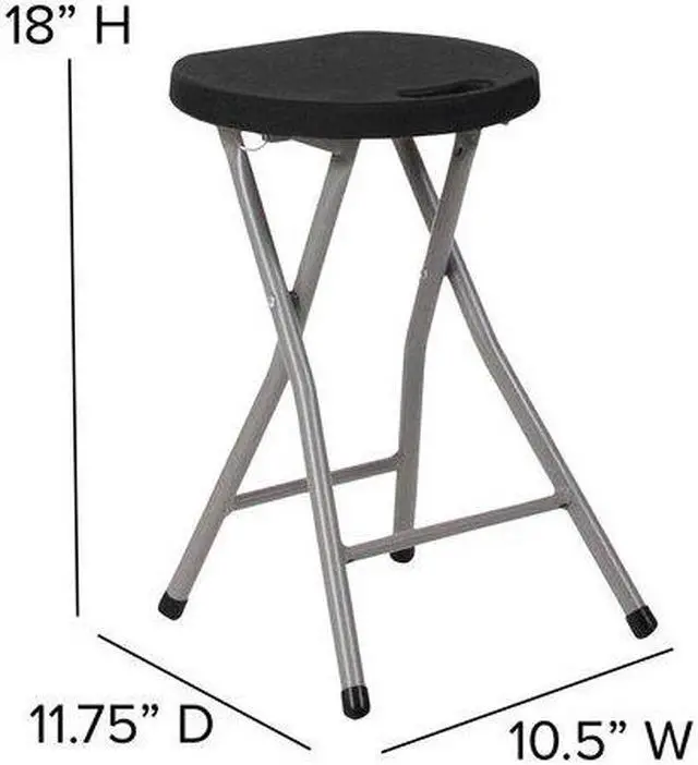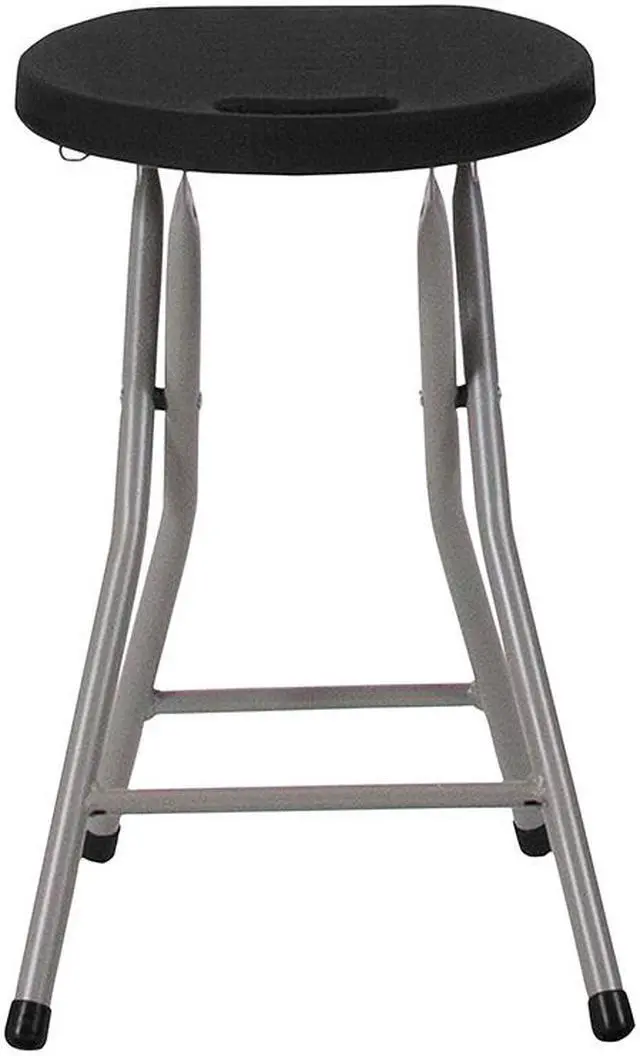 Need a convenient stool seat at a moment's notice? Never be short on seating again with this Foldable Stool with Plastic Seat. This stool is here to serve, and is perfect in the home, classroom or on the go! Foldable legs make for easy storage and setup at a moments notice. Thick acrylic plastic forms the seat, boasting a bold black color. When not needed, the stool folds up flat for storage. This backless stool is ideal for unexpected guests at home, holiday seating, or commercial use.