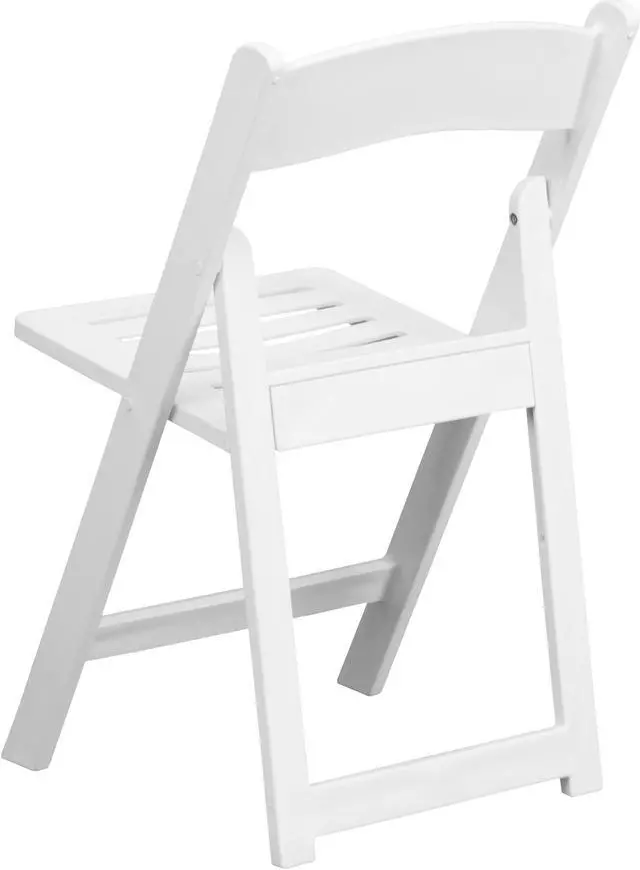 The White Resin Folding Chair combines comfort and elegance that looks good at all your special events, whether it's a backyard barbeque, a formal banquet or beach wedding. This chair is made from ultra-strong resin that's very lightweight, yet extremely strong and can hold up to 1000 pounds. The smooth frame is double braced for added stability and the front brace can be used as a footrest. The color of the frame is the same all the way through, so you don't have to worry about nicks and scratches. No re-painting or staining is ever needed; your chairs will look great for years to come. The easy to clean, durable design makes them the ideal choice for indoor and outdoor use. The chairs fold compactly to transport and store. Designed for residential and commercial use, these beautiful white resin folding chairs will make it an event to remember.