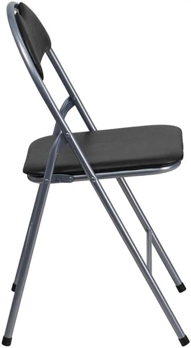 This is not your traditional metal folding chair this chair offers style with its open back design and modern appealing silver powder coated frame finish. Built for the commercial industry, these double braced metal chairs hold up to 300 lbs. This portable chair has a carrying handle for easy transport. No longer be unprepared when guests show up at your front door when you can pull these upholstered folding chairs from storage or closet. These chairs fold compactly with a depth of 1.75" for limited storage areas. The vinyl upholstery is easy to clean after you've invited everyone over to feast. Minimize the foot traffic in your home by hosting an outdoor gathering while taking advantage of the good weather or so people don't congregate inside your living room. Store these chairs indoors to protect the frames. These padded folding chairs come fully assembled to be of service upon delivery.