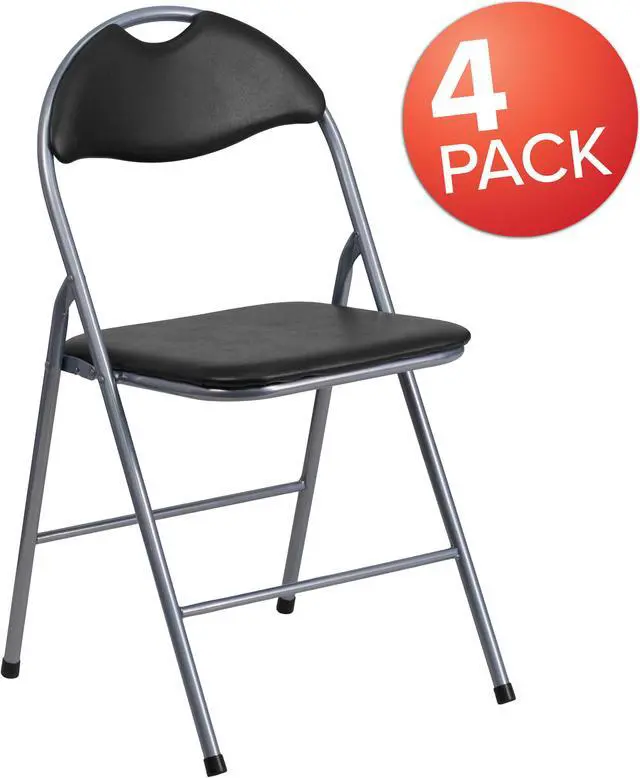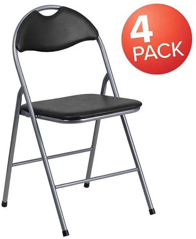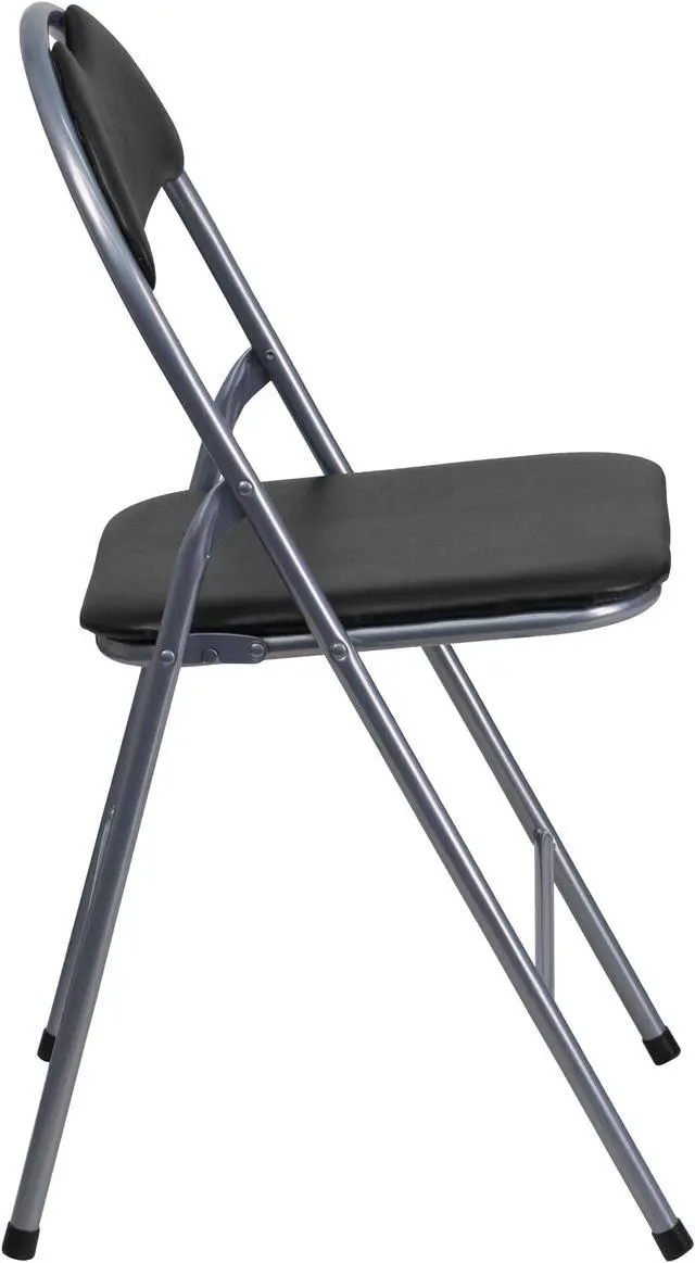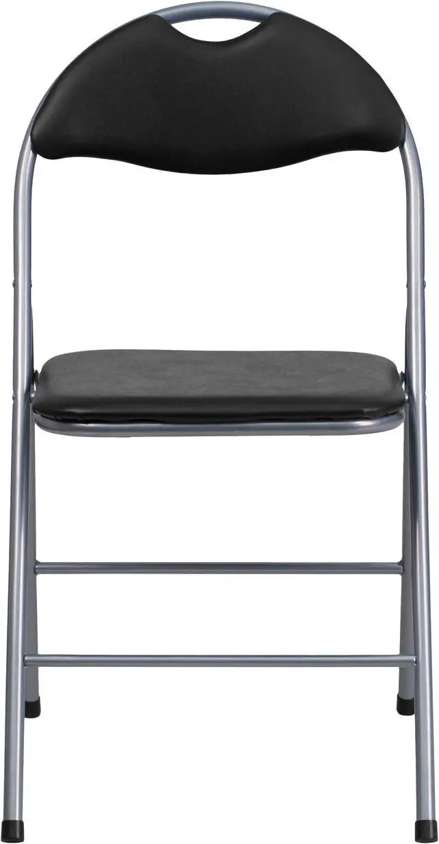 This is not your traditional metal folding chair this chair offers style with its open back design and modern appealing silver powder coated frame finish. Built for the commercial industry, these double braced metal chairs hold up to 300 lbs. This portable chair has a carrying handle for easy transport. No longer be unprepared when guests show up at your front door when you can pull these upholstered folding chairs from storage or closet. These chairs fold compactly with a depth of 1.75" for limited storage areas. The vinyl upholstery is easy to clean after you've invited everyone over to feast. Minimize the foot traffic in your home by hosting an outdoor gathering while taking advantage of the good weather or so people don't congregate inside your living room. Store these chairs indoors to protect the frames. These padded folding chairs come fully assembled to be of service upon delivery.
