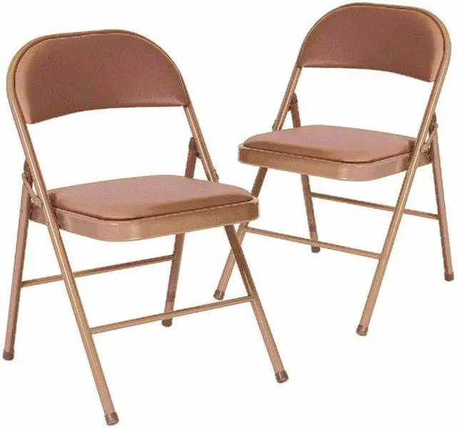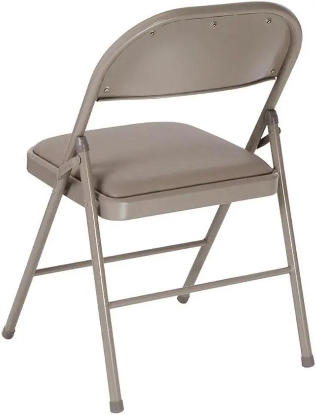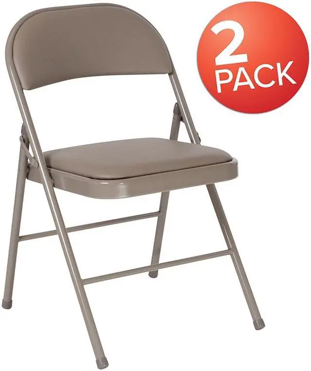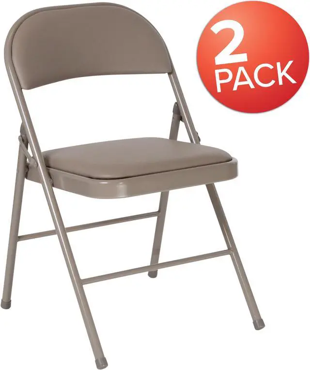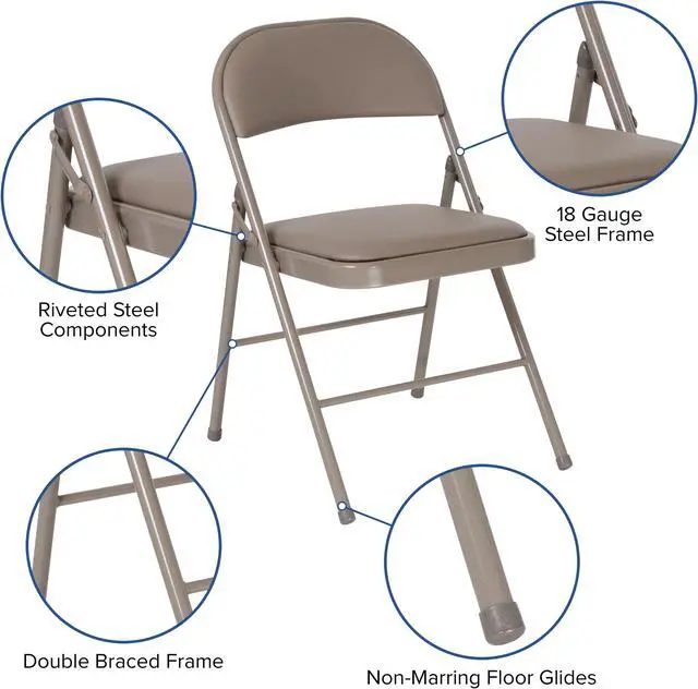 When your guest brings a surprise plus one handle the situation with ease by pulling out this classic metal folding chair with vinyl upholstery. This folding chair is built for everyday or occasional use in your business or home. The padded folding chair is upholstered in gray vinyl that is easy to clean and coordinates seamlessly with the frame. Its 18-gauge curved steel frame is double braced with leg strengthening support bars to hold up to 600 pounds static weight capacity while the non-marring floor glides protect your flooring. These portable folding chairs fold compactly to transport and store. Don't stay confined inside, take your social event outdoors and enjoy the weather, protect the frame from extreme moisture by storing indoors. These attractive chairs are a smart seating solution for your next business meeting or special event. With nothing to assemble these chairs come ready to service your needs.