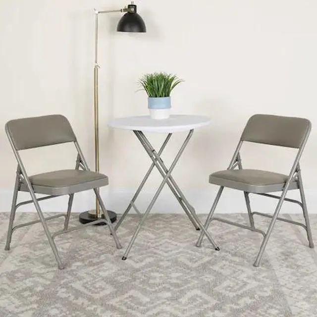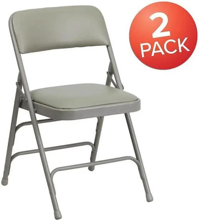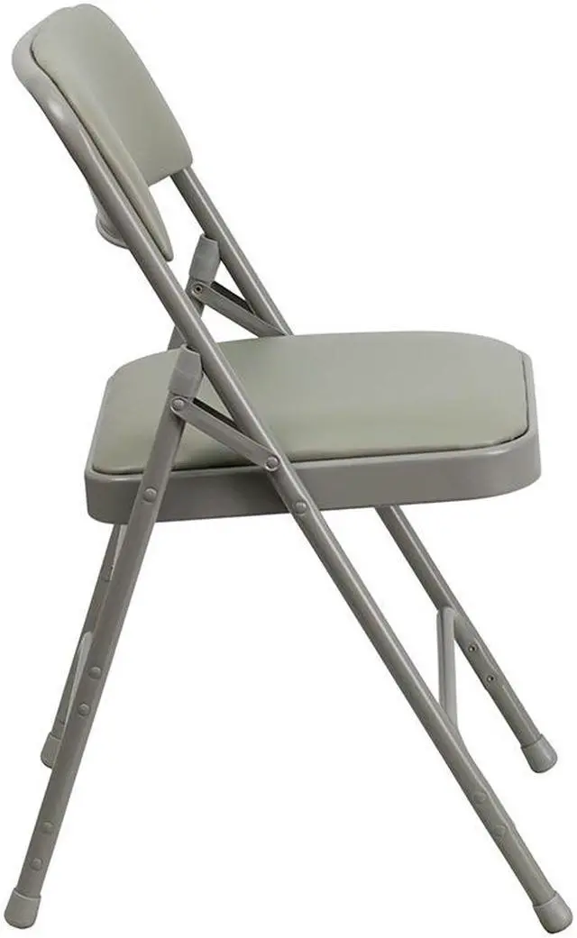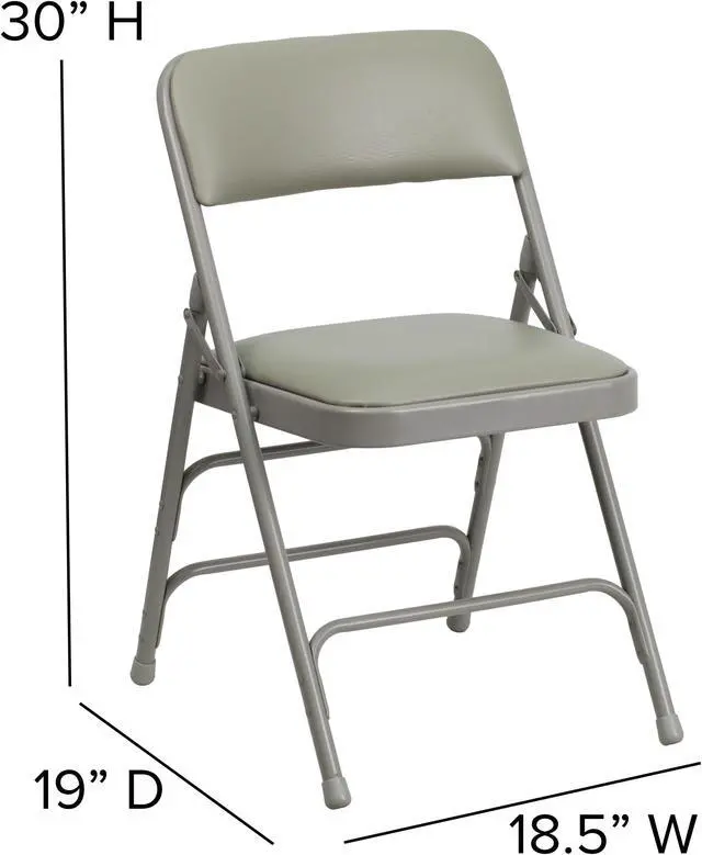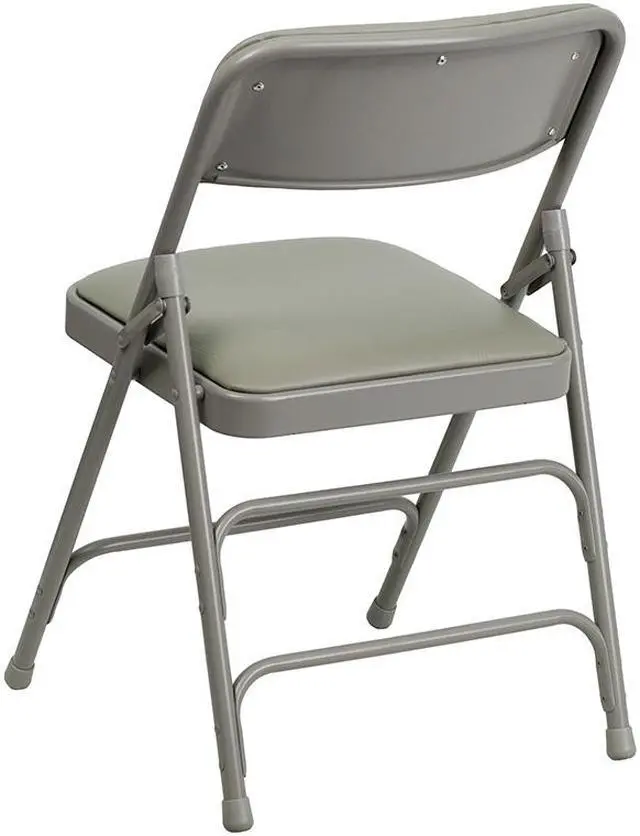 This classic metal folding chair with vinyl upholstery is a convenient option for everyday use or when you need extra seating in a residential or commercial setting. The comfortable seat is padded with 1" of foam. The seat and back are covered in gray vinyl that matches the gray frame finish. Its 18 gauge curved steel frame is triple braced and Double Hinged with leg strengthening support bars to hold up to 300 pounds. These chairs are portable and fold compactly to transport and store. Non-marring floor glides on the legs protect your floors from scuffs and scrapes by sliding smoothly when you move them. Designed for indoor and outdoor use, these attractive chairs are a smart seating solution for your next business meeting or special event.