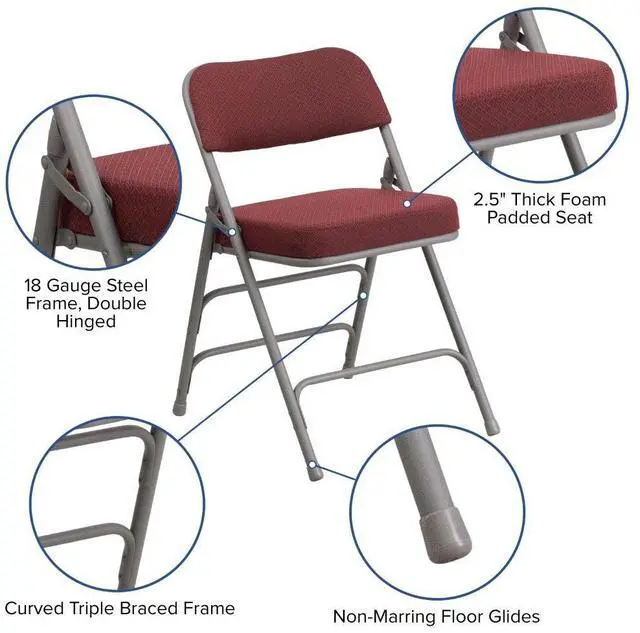 Guests will be amazed in the comfort of this ultra-padded upholstered metal folding chair. Whether you have planned for your guest's arrival or had a sudden influx of family show up on your doorsteps you'll be well prepared with these padded folding chairs. Suitable for everyday use you can host holiday parties, birthdays, girl's night in and game night with chairs that setup quickly and store compactly. Enjoy the good weather by going outdoors to dine and play games. Padded folding chairs provide comfort during extended meetings and social gatherings. Its 18-gauge curved powder coated steel frame is triple braced, and double hinged with leg strengthening support bars to hold up to 300 pounds.
