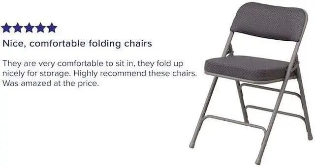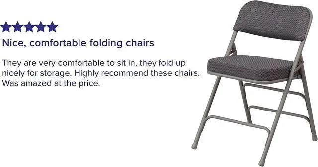 - Top Review: Needed some comfortable folding chairs for parties and group meetings. These chairs are comfortable, sturdy and attractive. Exactly as advertised and shipped in a timely manner.