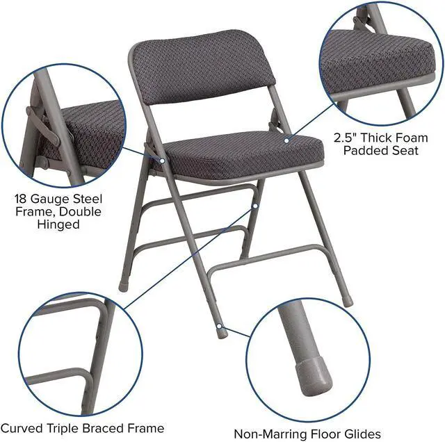 Guests will be amazed in the comfort of this ultra-padded upholstered metal folding chair. Whether you have planned for your guest's arrival or had a sudden influx of family show up on your doorsteps you'll be well prepared with these padded folding chairs. Enjoy the good weather by going outdoors to dine and play games. Padded folding chairs provide comfort during extended meetings and social gatherings. Its 18-gauge curved powder coated steel frame is triple braced, and double hinged with leg strengthening support bars to hold up to 300 pounds. Non-marring floor glides protect your floors. Built for commercial use these attractive chairs are a smart seating solution for your next business meeting as well as in the home for family gatherings and other social events. After outdoor events, store indoors to protect the frames from extreme moisture. With nothing to assemble these chairs come ready to service your needs.