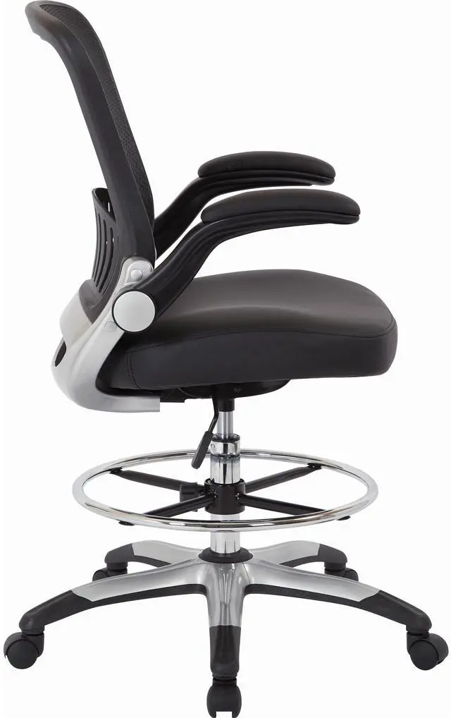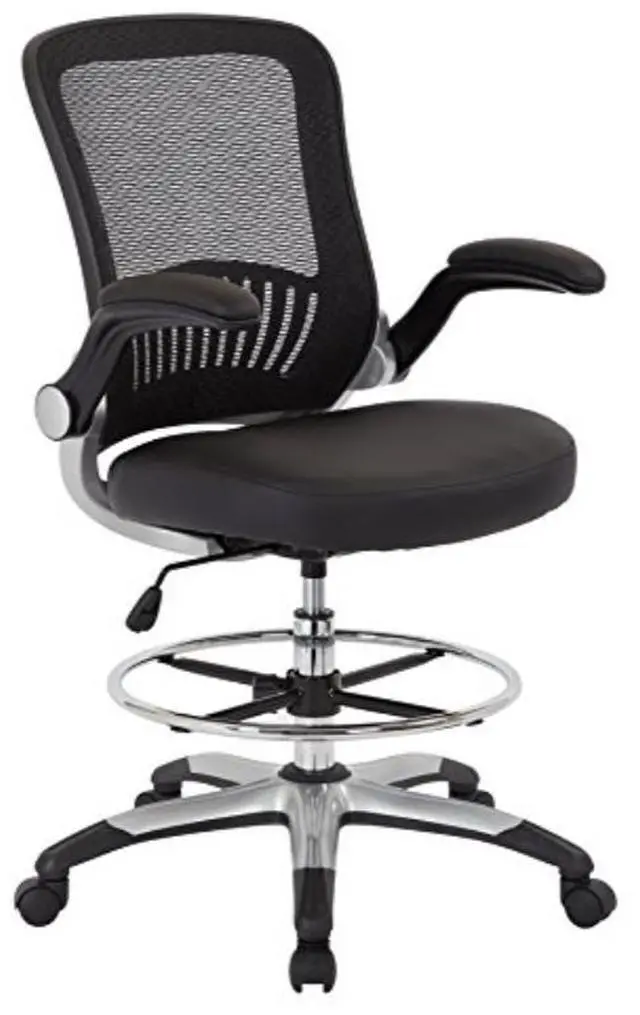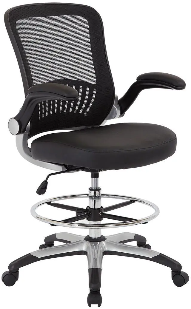 MESH BACK DRAFTING CHAIRElevate your work experience with this deluxe drafting chair designed for comfort. A breathable mesh back with built in lumbar support and thick padded seat cradles your body throughout the work day letting you keep your focus and stay productive. Enjoy an ample seat height adjustment area to find just the right zone for your needs along with an adjustable foot ring to keep your footing while you work. Upgrade your office seating with the sleek design of the Work Smart Mesh Back Drafting Chair.
