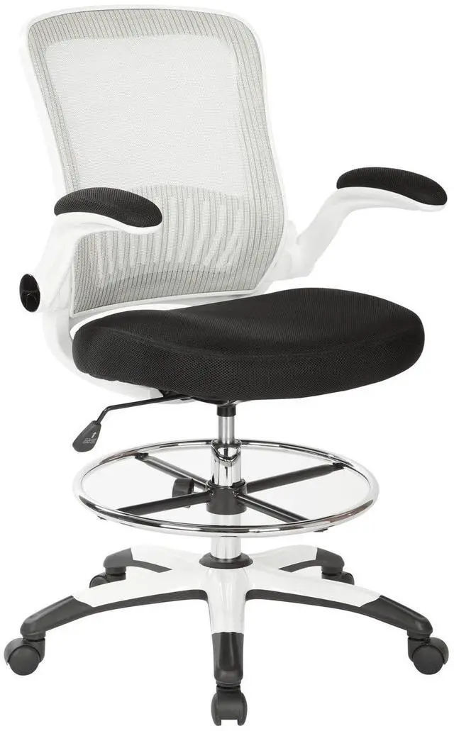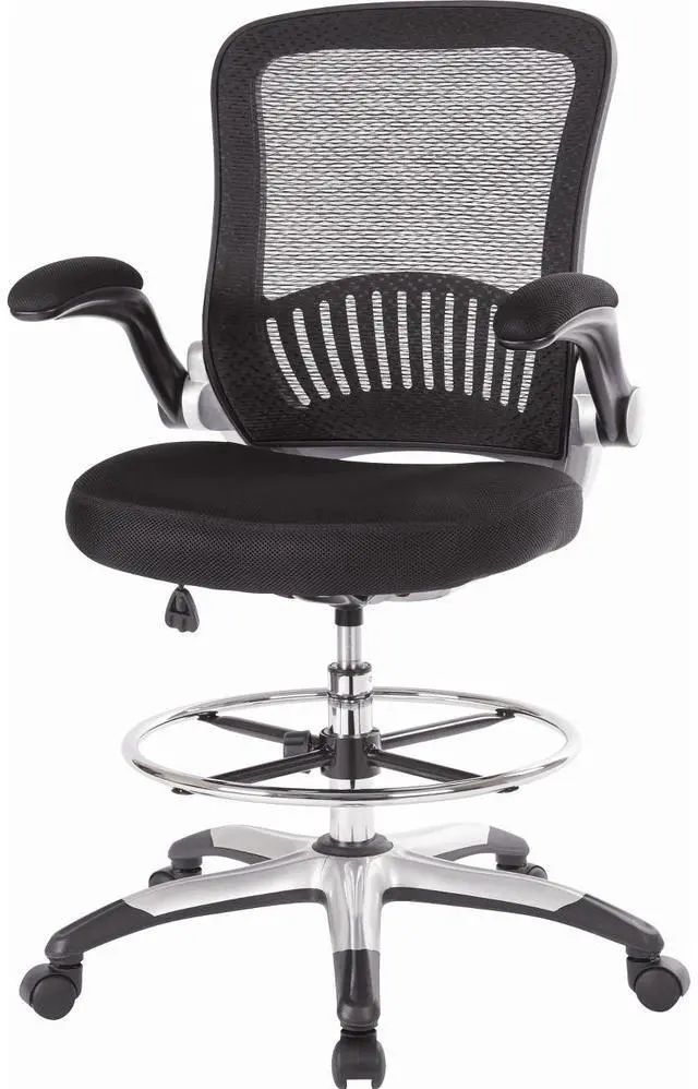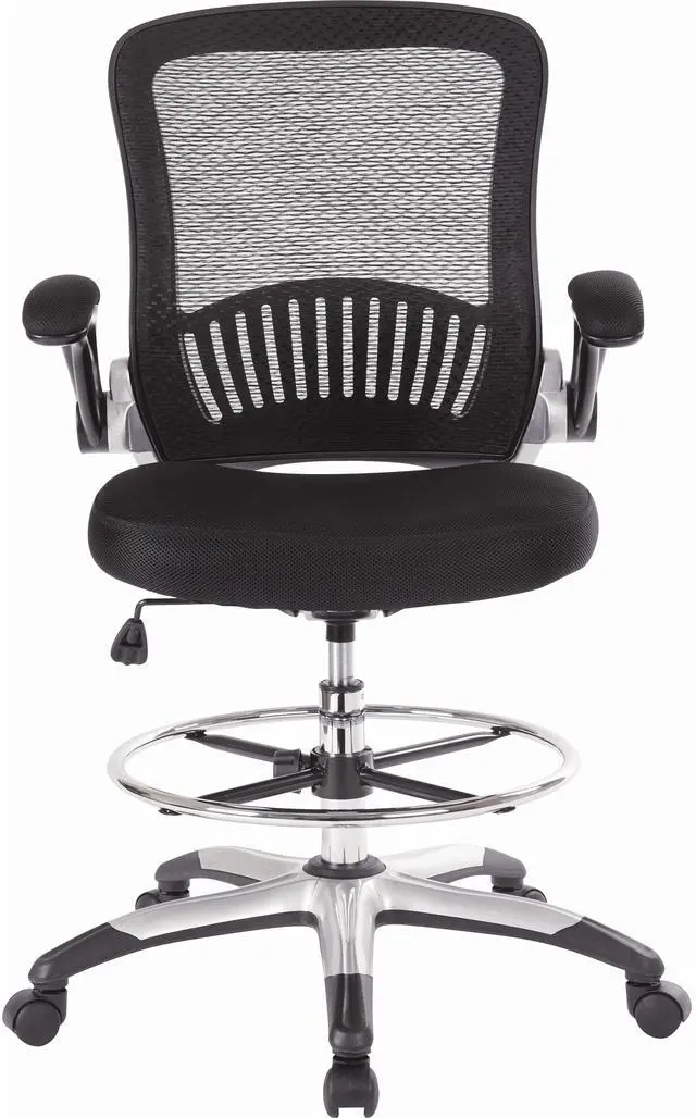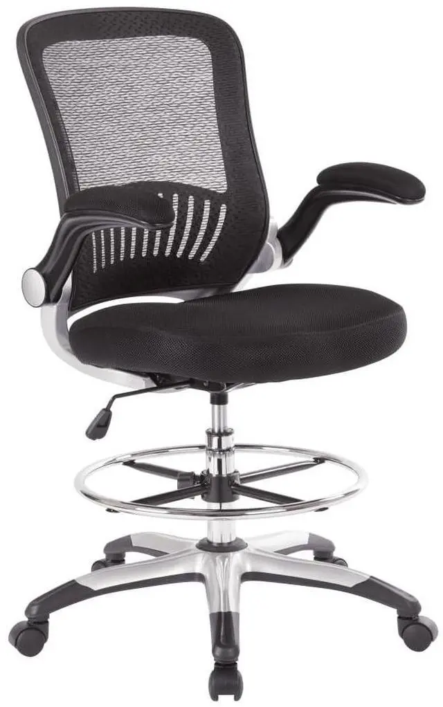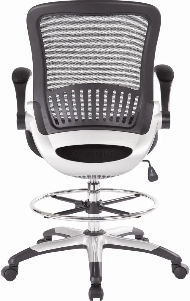 MESH BACK DRAFTING CHAIRElevate your work experience with this deluxe drafting chair designed for comfort. A breathable mesh back with built in lumbar support and thick padded seat cradles your body throughout the work day letting you keep your focus and stay productive. Enjoy an ample seat height adjustment area to find just the right zone for your needs along with an adjustable foot ring to keep your footing while you work. Upgrade your office seating with the sleek design of the Work Smart Mesh Back Drafting Chair.