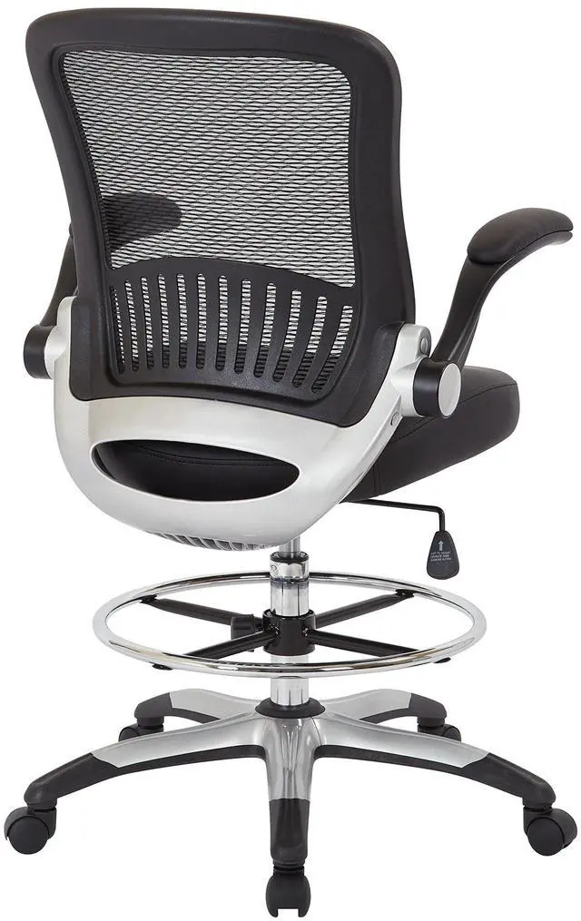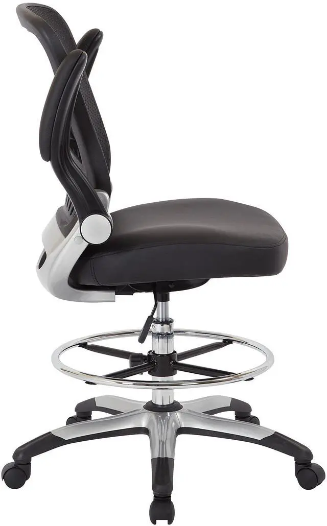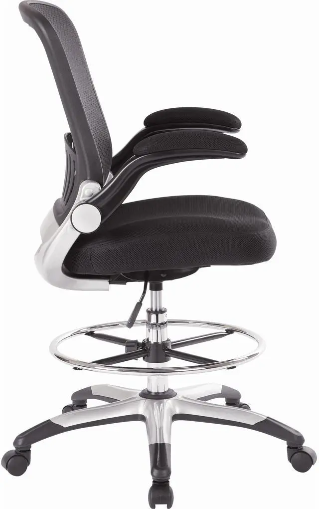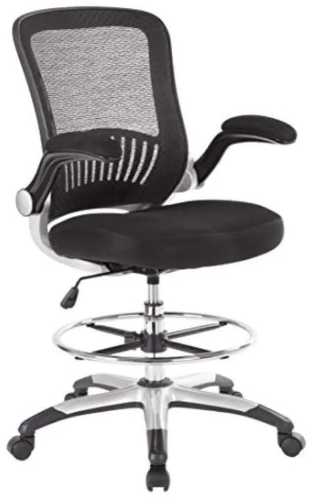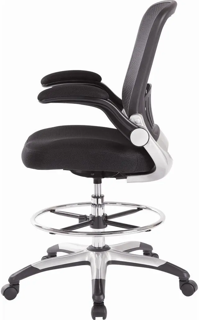 MESH BACK DRAFTING CHAIRElevate your work experience with this deluxe drafting chair designed for comfort. A breathable mesh back with built in lumbar support and thick padded seat cradles your body throughout the work day letting you keep your focus and stay productive. Enjoy an ample seat height adjustment area to find just the right zone for your needs along with an adjustable foot ring to keep your footing while you work. Upgrade your office seating with the sleek design of the Work Smart Mesh Back Drafting Chair.