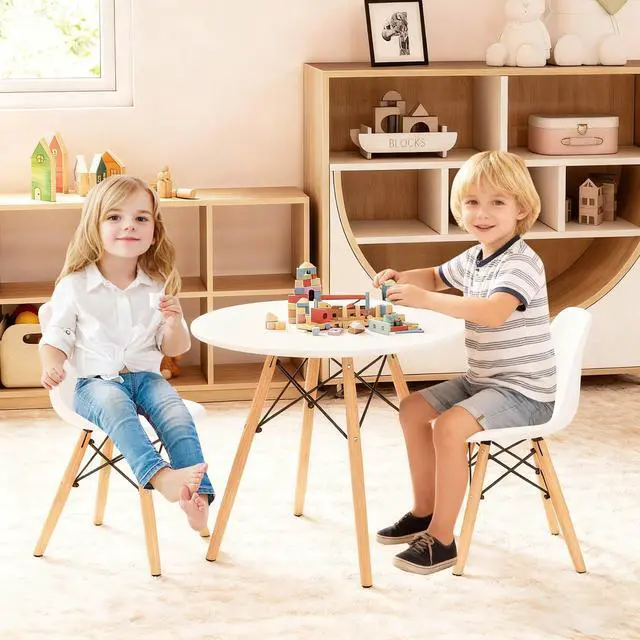 Do the children want their own lovely furniture? Our table and chairs set is a perfect choice for you. Includes a round table and two armless chairs that are good for children to eat, write, draw, read, puzzle and play by themselves. The combination of wood legs and iron frame of the base adds to the aesthetic value of the design while ensuring the stability of the set. The chairs feature ergonomic curved back, which perfectly adapts to the shape of the body. A round and smooth table top protects your child from harm. And non-slip rubber pads under the legs protect the floor from being scratched and add the stability. It is the best gift for children. Don't hesitate to buy it