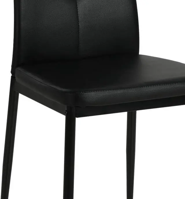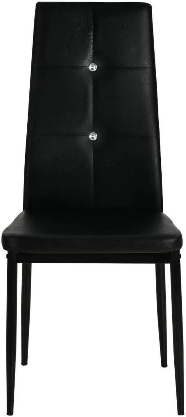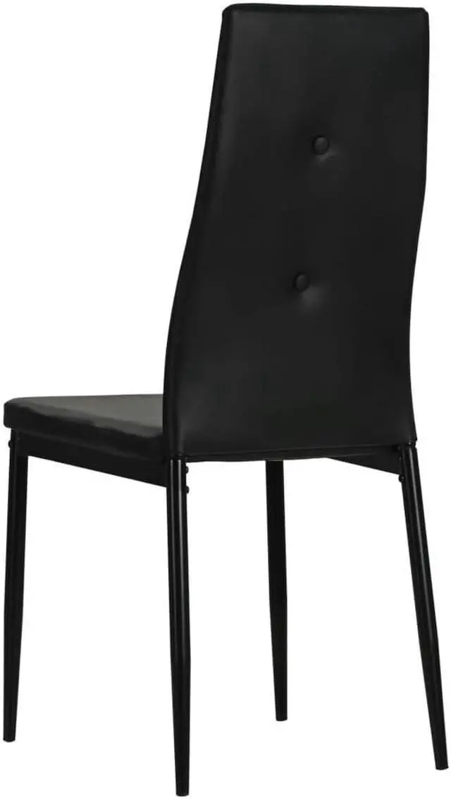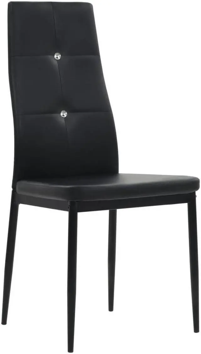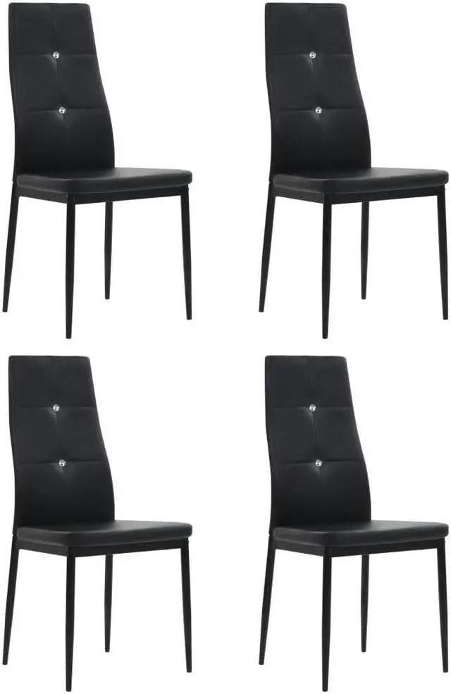 These high-quality dining chairs have a chic and elegant design, and will add a modern touch to your decor. The chair has a wooden frame with steel legs and a padded seat covered in artificial leather. The ergonomically shaped backrest is decorated with a pair of crystals to give each chair its exquisite look. The chairs are easy to assemble. Delivery includes 4 dining chairs.