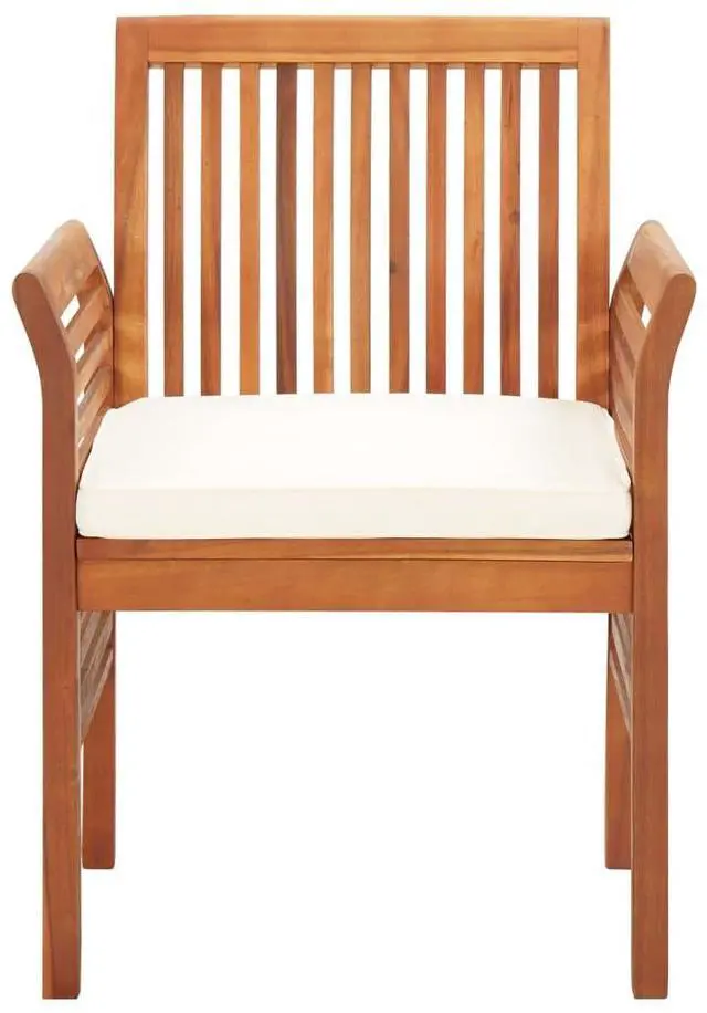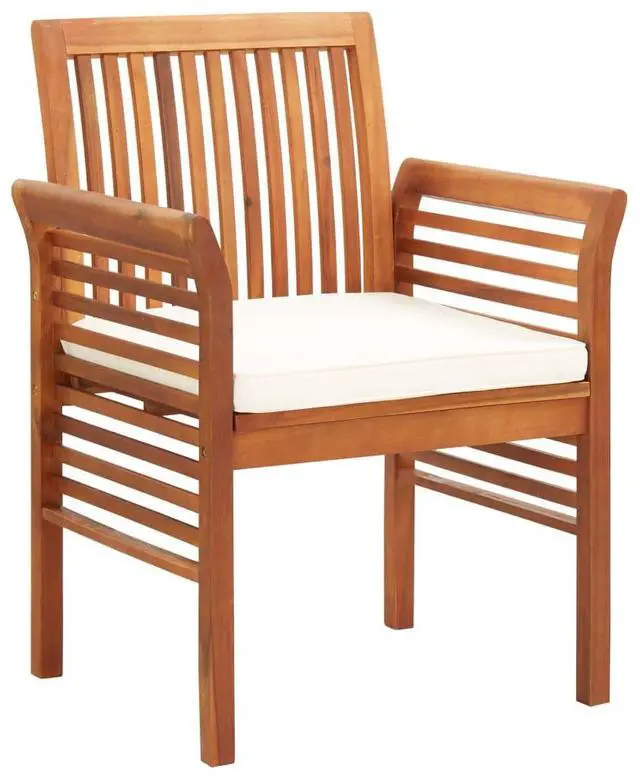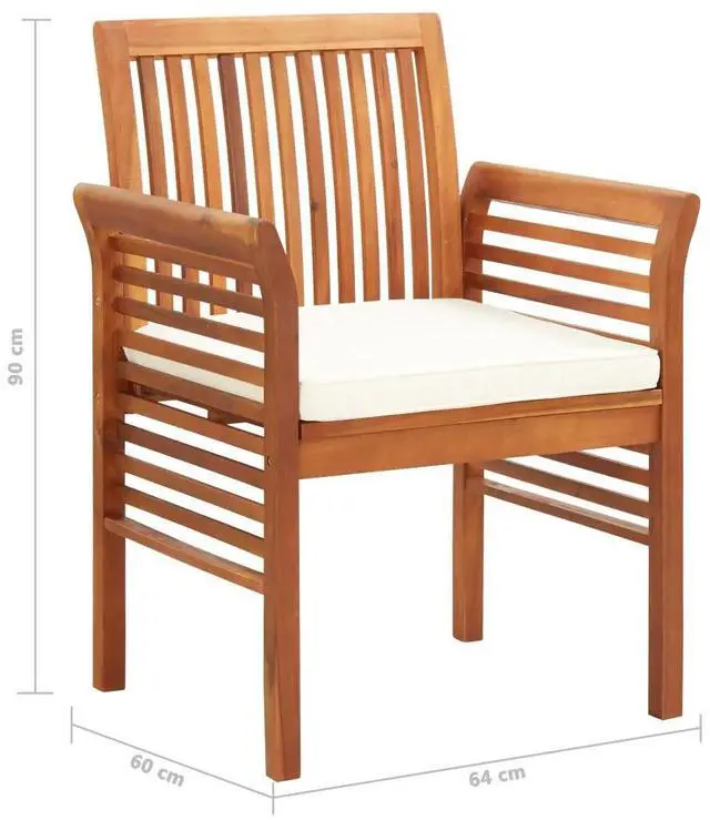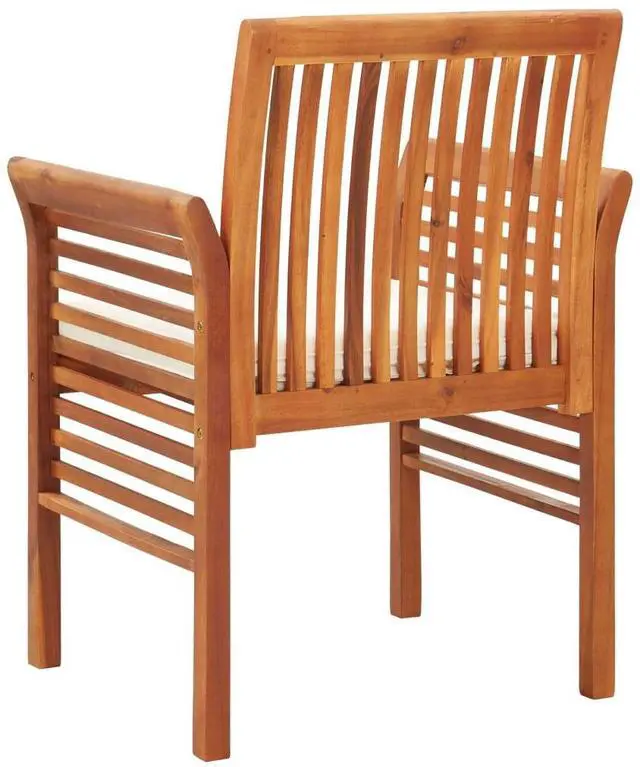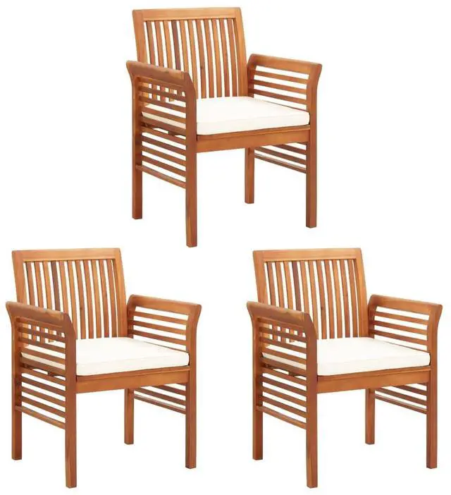 vidaXL Garden Dining Chairs with Cushions 3 pcs Solid Acacia Wood - 45966, Eating outside should feel like a special event no matter what kind of occasions. Our wooden dining chair is an optimal choice for you. Featuring an acacia wood frame with a weather resistant finish, this acacia wood chair brings a classic look to your patio or backyard while giving your outdoor space a natural feel. Literally sit back and relax, designed with the deep-seat and cozy foam pad, you can spend all lounging outdoors in superior comfort. The water resistant cushion will allow for easy cleaning. The chair is easy to assemble. Delivery includes 3 dining chairs.