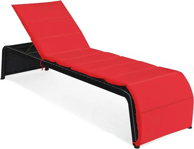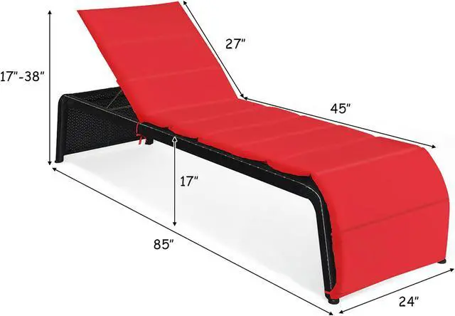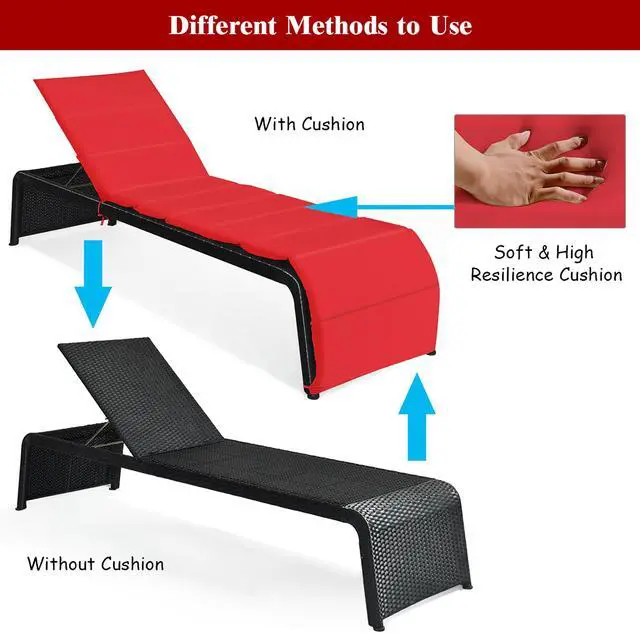 This chaise lounge will help you to enjoy the baptism of the sun in outdoor space. Made of premium rattan and heavy-duty steel frame, the lounge is sturdy and can withstand change of weather outdoors. And the weight capacity of lounge is about 700 lbs. The reclining chair can be adjusted in five different positions so you can choose the most comfortable angle by yourself. In addition, the lounge is also equipped with a removable cushion. The thick sponge in the cushion provides comfortable seating experience. The surface of cushion is waterproof and can be rinsed if it is dirty. The lounge chair is an ideal choice for poolside, patio, porch, and seaside to enjoy fresh air everywhere.