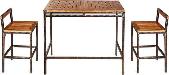 This is our 3 pieces patio bar set including 1 spacious table and 2 bar chairs for perfect outdoor use. Made of high-standard steel frame and premium PE rattan, this outdoor furniture set has a stable and sturdy frame. Whats more, the tabletop and the seat of chair is featuring with solid acacia wood which is weather resistant for long time use. The steel legs with non-slip foot pads add the extra stability to the table and chairs. Combining with the classic color and concise appearance, this bar set can harmoniously match with both indoor and outdoor environment such as garden, courtyard and balcony. Besides, the bar set doesnt take up much space because of the compact and space saving design. Give yourself some leisure time to relax with your favorite beverage or books with our outdoor rattan bar furniture set.