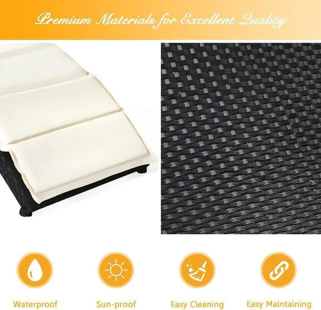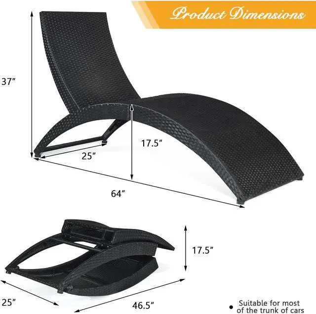 Are you looking for a suitable resting place for your outdoor living? This rattan lounge chair is made of weather resistant PE rattan and steel which has long service life. What's more, the seat with scientific curve is roomy and allows your legs to place comfortably when you lie on it. Quick folding design is convenient for you to store and transport. Because of the lightweight materials, this lounge chair can be easily moved to anywhere you want. The lounge chair is an ideal choice for poolside, patio, porch, and seaside so you can enjoy yourself everywhere. Designed in modern and concise style, this chair is great for indoor and outdoor use and perfectly become your patio or home decor. Just spend the cozy free time outside with our wicker rattan lounger chair!