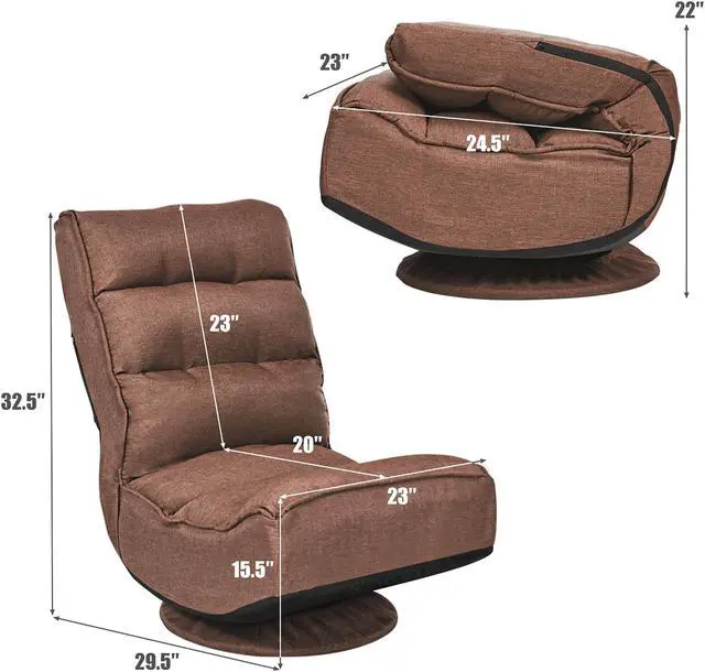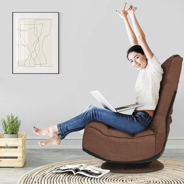 Sit in comfort with our adjustable swivel floor chair. This folding floor gaming chair is filled with high density sponge that is soft to touch. High quality fabric covering is breathable, tear-resistant and sturdy for long term use.Compared with other common floor chairs, our uniquely designed floor gaming chair features 360-degree swivel design that will add much fun to your leisure time. 6 adjustable backrest angles enable you to find the most comfortable sitting position. Besides, this swivel floor chair is equipped with a removable base cover to protect your floor from scratching. It can be easily taken off for cleaning when getting dirty. The backrest of this chair is also foldable for easy storage. With its simple and modern appearance, it will perfectly match with any home styles.