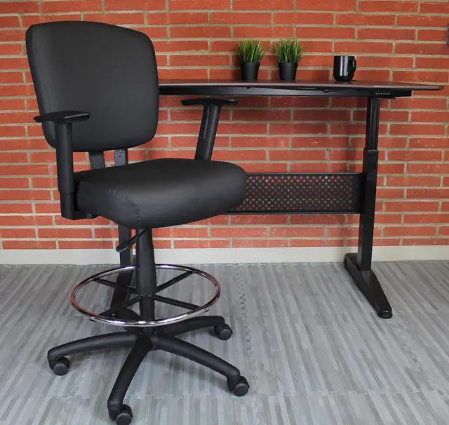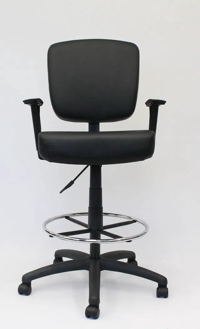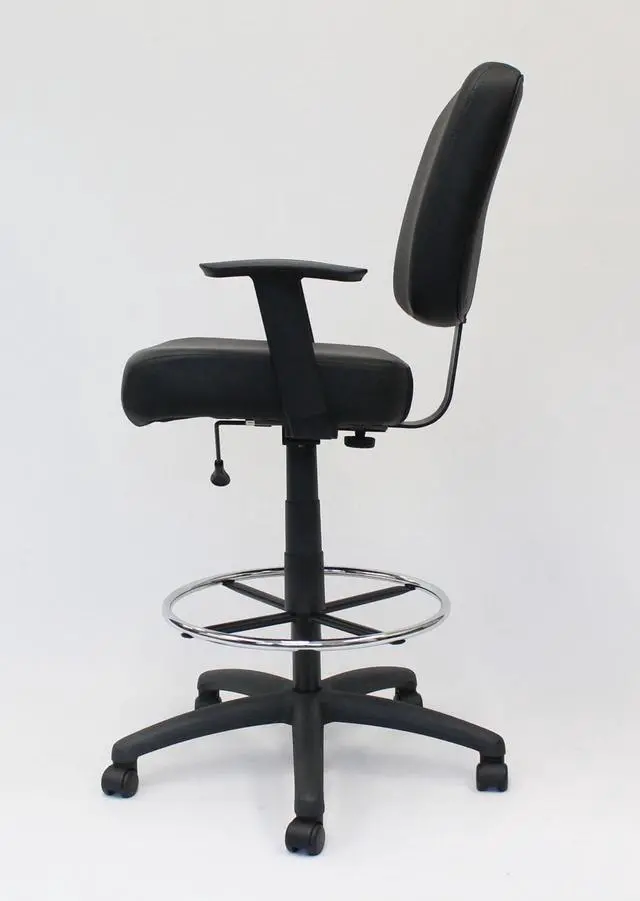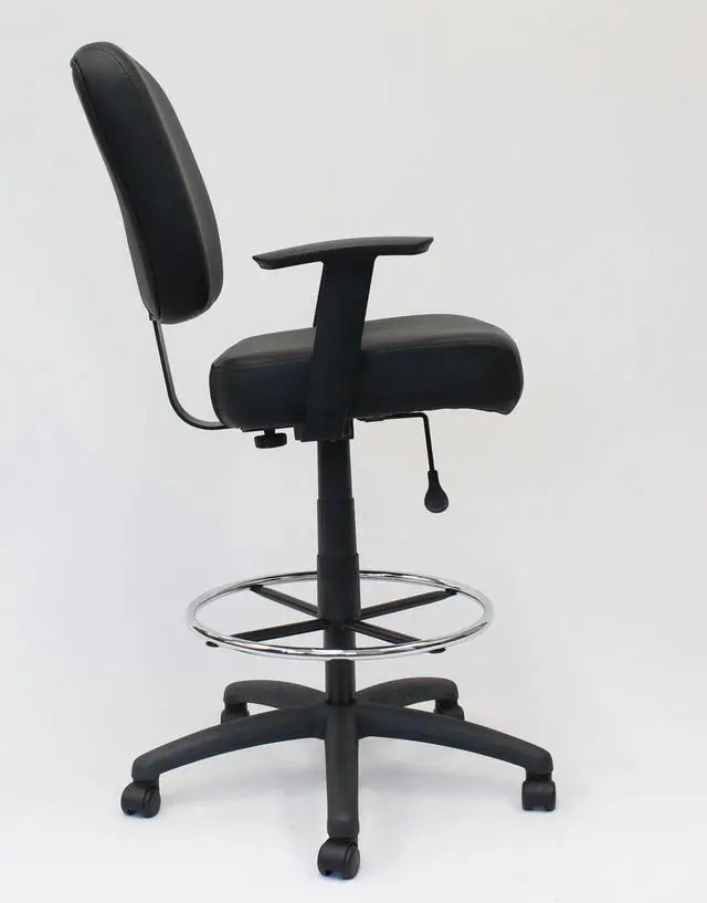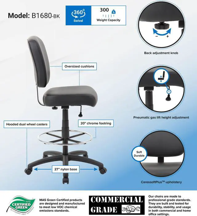 * Product Type: Chair<br /> * Product Type: Chair<br /> * Packaged Quantity: 1 Each<br /> * Limited Warranty: 6 Year<br /> * Features: Pneumatic Adjustment<br /> * Features: Gas Lift<br /> * Features: Hooded Double Wheel Caster<br /> * Features: Comfortable<br /> * Features: Breathable<br /> * Features: Durable<br /> * Features: Easy Clean<br /> * Features: Sturdy<br /> * Features: Foot Ring<br /> * Product Name: Oversized Drafting Stool with Foot Rest Black<br /> * Maximum Load Capacity: 275 lb<br /> * Brand Name: Boss<br /> * Maximum Load Capacity: 275 lb<br /> * Brand Name: Boss<br /> * Frame Color: Black<br /> * Country of Origin: China<br /> * Height: 43"<br /> * Width: 27"<br /> * Depth: 27"<br /> * Frame Color: Black<br /> * Number of Casters: 5<br /> * Base Material: Nylon<br /> * Seat Material: Vinyl<br /> * Chair/Seat Type: Drafting Stool<br /> * Adjustable Seat: Yes<br /> * Seat Color: Black<br /> * Maximum Seat Height: 30"<br /> * Back Color: Black<br /> * Back Height: 16.50"<br /> * Back Width: 19.50"<br /> * Seat Feature: Height Adjustment<br /> * Seat Feature: Upholstered<br /> * Environmentally Friendly: Yes<br /> * Environmental Certification: MAS Certified Green<br /> * Number of Casters: 5<br /> * Base Material: Nylon<br /> * Seat Material: Vinyl<br /> * Seat Width: 19"<br /> * Seat Depth: 19.50"<br /> * Chair/Seat Type: Drafting Stool<br /> * Adjustable Seat: Yes<br /> * Seat Color: Black<br /> * Minimum Seat Height: 26.50"<br /> * Maximum Seat Height: 30"<br /> * Back Material: Vinyl<br /> * Back Color: Black<br /> * Back Height: 16.50"<br /> * Back Width: 19.50"<br /> * Base Shape: 5-star<br /> * Seat Feature: Height Adjustment<br /> * Seat Feature: Upholstered<br />* Product Type: Chair<br /> * Maximum Load Capacity: 275 lb<br /> * Brand Name: Boss<br /> * Frame Color: Black<br /> * Number of Casters: 5<br /> * Base Material: Nylon<br /> * Seat Material: Vinyl<br /> * Chair/Seat Type: Drafting Stool<br /> * Adjustable Seat: Yes<br /> * Seat Color: Black<br /> * Maximum Seat Height: 30"<br /> * Back Color: Black<br /> * Back Height: 16.50"<br /> * Back Width: 19.50"<br /> * Seat Feature: Upholstered<br /> * Seat Feature: Height Adjustment<br />