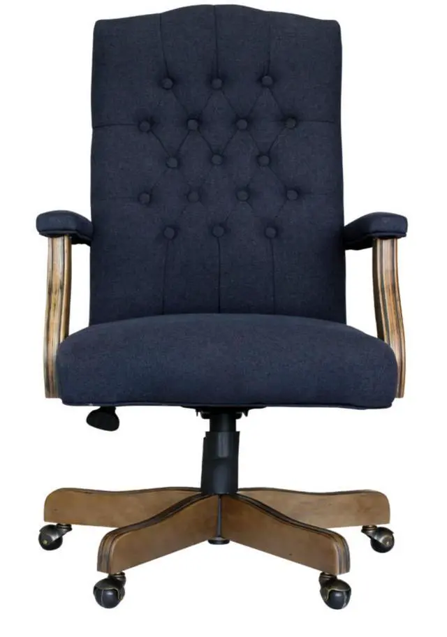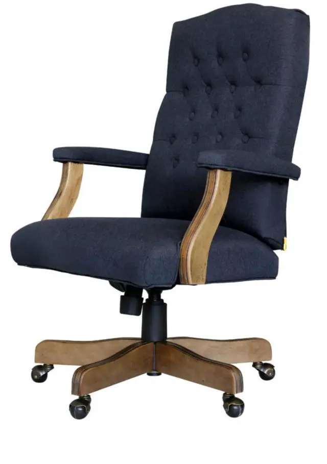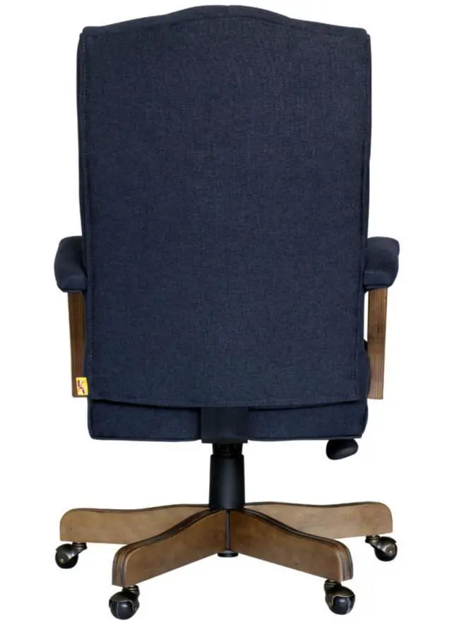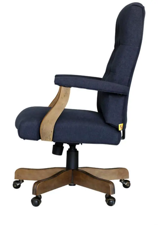 When it comes to class and style the executive commercial grade linen chair in denim blue with driftwood finish frame is top of the line. The chair boasts a sturdy 27 inch traditional driftwood base with hooded brass castors for an elegant look, with a smooth roll. The padded arms are set at a fixed height and the chair utilizes a spring tilt mechanism. In addition to this, the chair also offers tilt tension, a pneumatic gas lift for easy height adjustability and an upright lock.